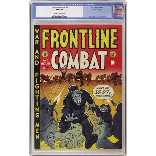 <B>Frontline Combat #6 Gaines File pedigree 3/9 (EC, 1952) CGC NM+ 9.6 Off-white to white pages.</B></I> This title remains one of the real bargains among the EC titles of the period, with typically terrific art by Harvey Kurtzman, John Severin, Wally Wood, Bill Elder (all in this issue), and some of Kurtzman's best writing. This unreal copy has received the highest grading that CGC has given to date for issue #6. Overstreet 2006 NM- 9.2 value = $300. CGC census 10/06: 3 in 9.6, none higher.<BR><BR><b>Shipping:</b> Slabbed Comic (<a target="_blank" href="http://www.heritageauctions.com/common/shipping.php">view shipping information</a>)