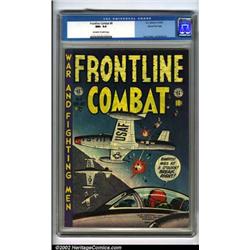 Frontline Combat #8 Gaines File pedigree 6/9 (EC, 1952). This Harvey Kurtzman cover has to be one of the earliest air battle covers to feature jets in combat. As always, the interior art is first-rate, with contributions from comic legends Jack Davis, Bill Elder and Wally Wood. Bill Gaines only saved nine copies of this issue. A true gem, suitable for even the most discriminating collector. CGC NM+ 9.6 Off-white to white pages. Overstreet 2001 NM 9.4 value = $175. Important notice: We expect to be auctioning lots at the rate of 200-250 per hour. Sometimes eBay Premier live bid software cannot keep up with that pace, so we strongly recommend that you place a realistic proxy bid now as insurance to avoid disappointment. Also please note that all Heritage/CAA lots purchased through eBay Premier carry a 20% Buyer's Premium.