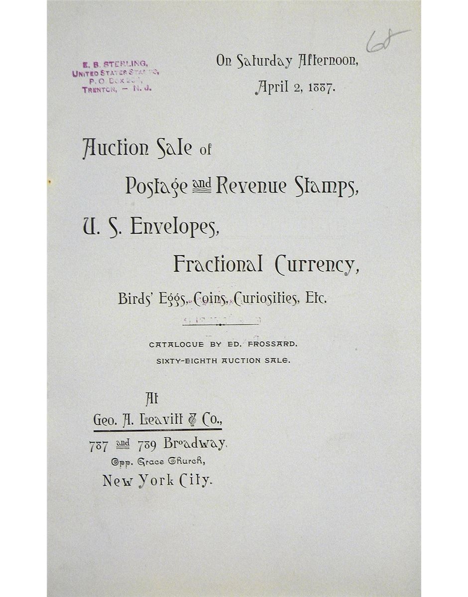 Frossard, Ed. AUCTION SALE OF POSTAGE AND REVENUE STAMPS, U.S. ENVELOPES, FRACTIONAL CURRENCY, BIRDS' EGGS, COINS, CURIOSITIES, ETC. New York, April 2, 1887. 8vo, original printed wraps. 16 pages; 400 lots. Near fine. E.B. Sterling may have had some involvement with this sale.
