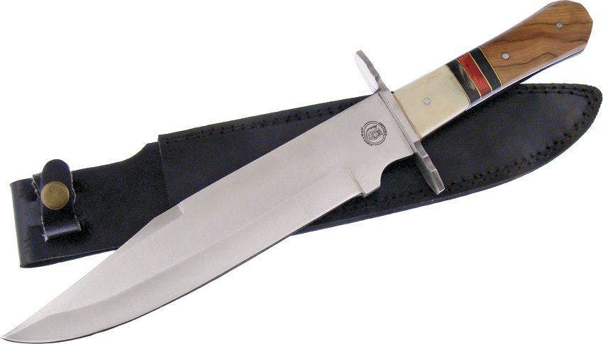 Chipaway Tennessee Toothpick - 15" overall. 10 1/2" stainless bowie blade. Blonde wood handles with metal spacers and stainless guard. Brown leather belt sheath.