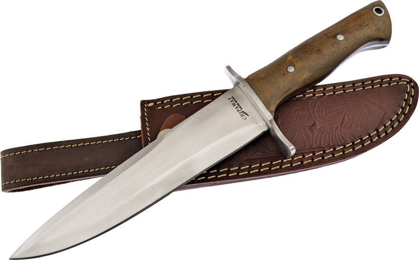 12" overall. 7" stainless blade. Dark wood handle with stainless guard and lanyard hole. Brown leather belt sheath.
