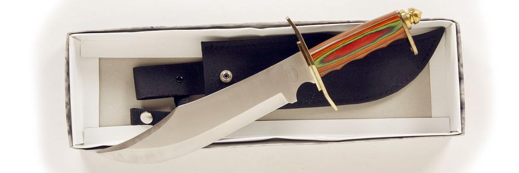 Frost Cutlery Great Plains Bowie Knife with nylon sheath, like new in the box, with brass guard and multi-colored wood handle.