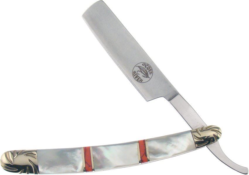 Ocoee River Razor - 4 3/4" closed. 2 3/4" stainless razor blade. Genuine mother of pearl handles with red composition inlay stripes and brass spacer stripes. Embossed brass bolsters.