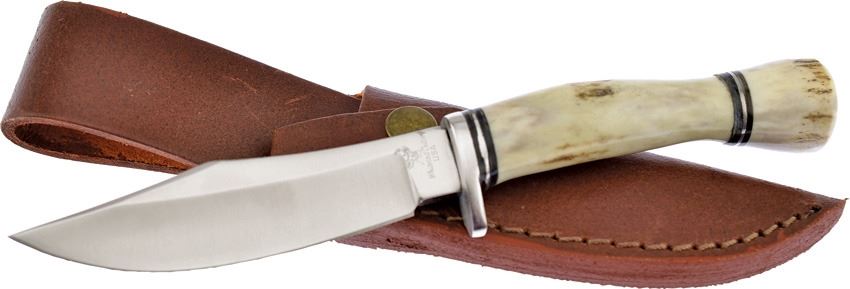 7 5/8" overall. 4" stainless blade. Deer stag handle. Stainless finger guard. Brown leather belt sheath.