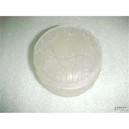 Vintage Frosted Crystal Parrots Powder Jar.2 embossed parrots on the lid. 4-1/2" wide x 2-3/4" tall. Good condition except 2 tiny chips on inside rim of lid.