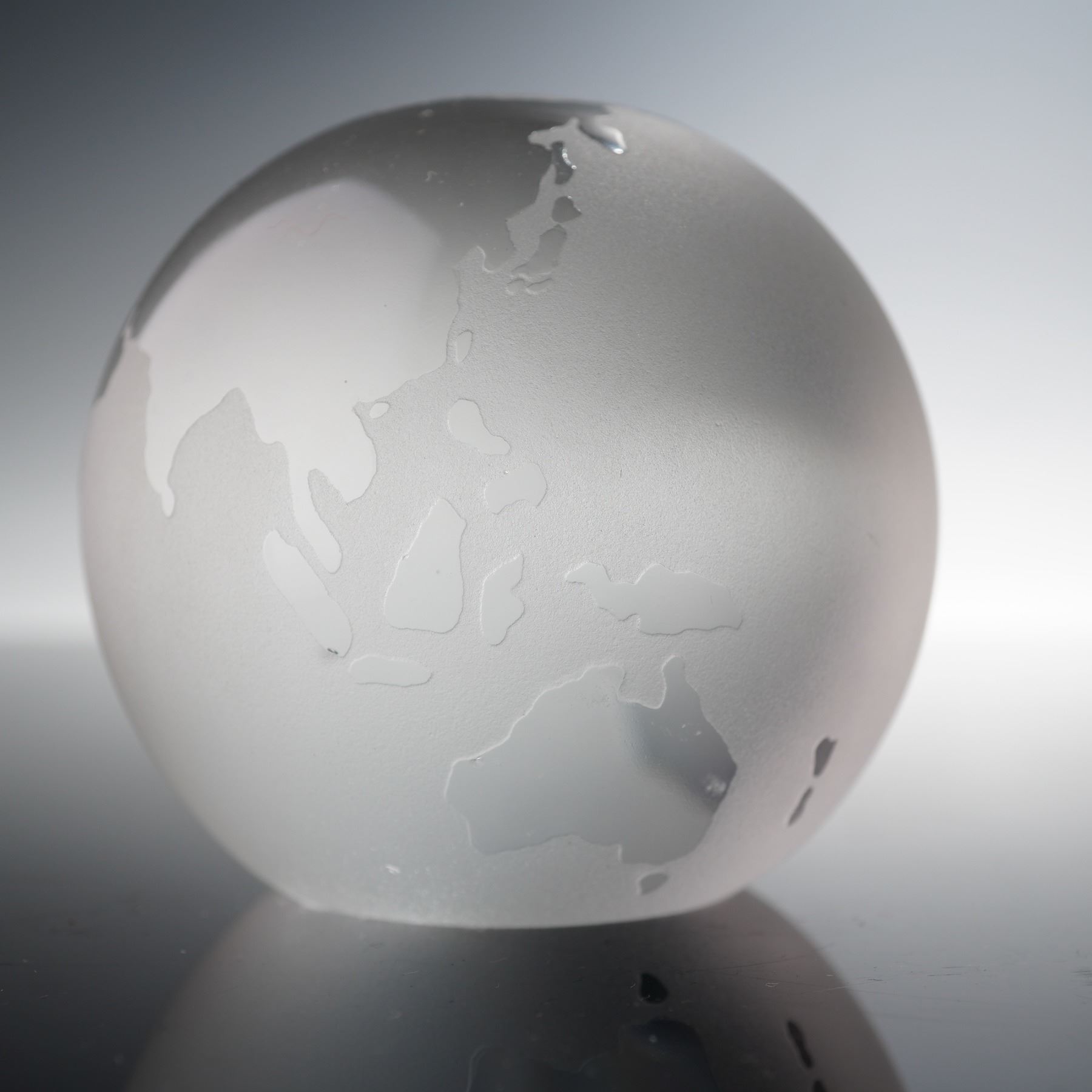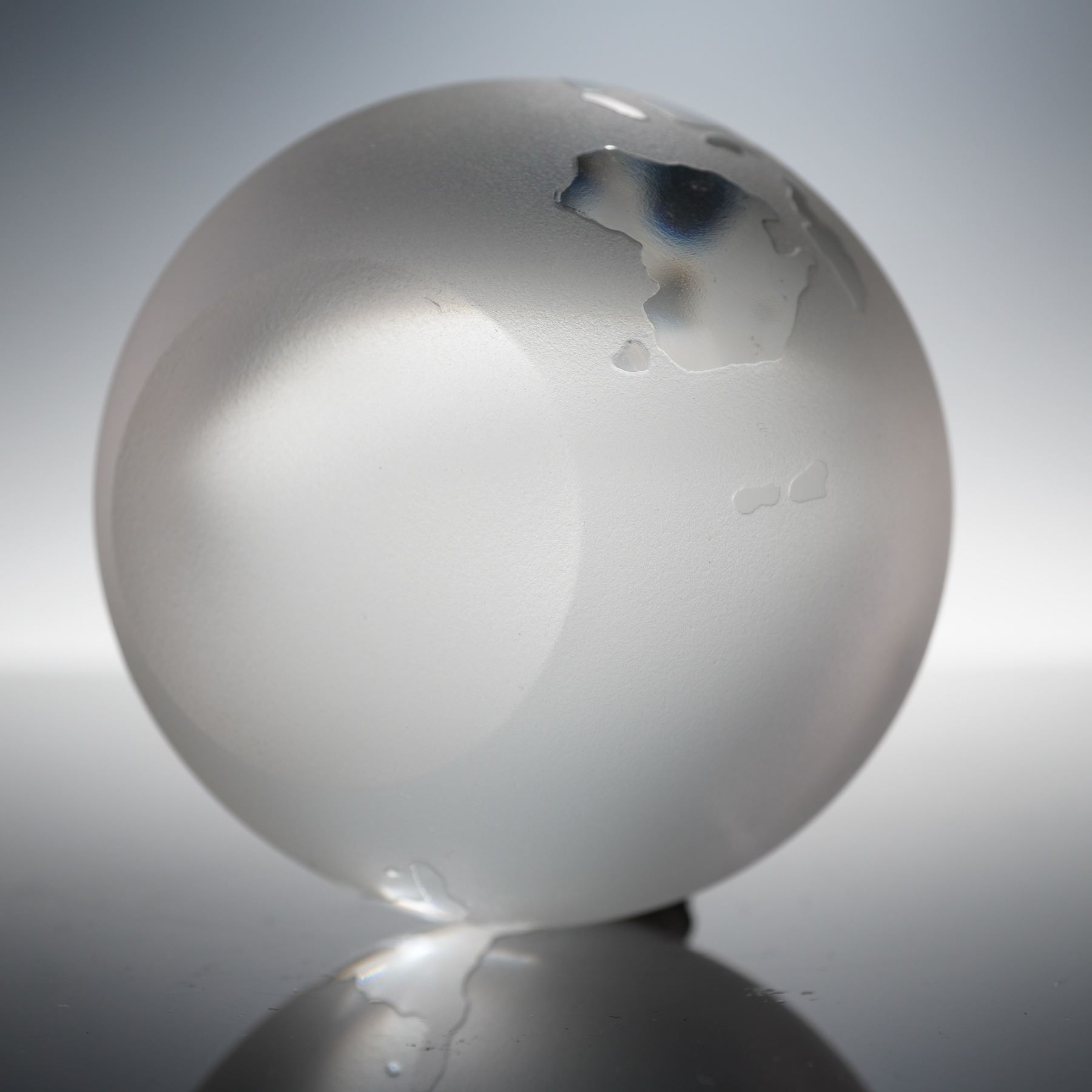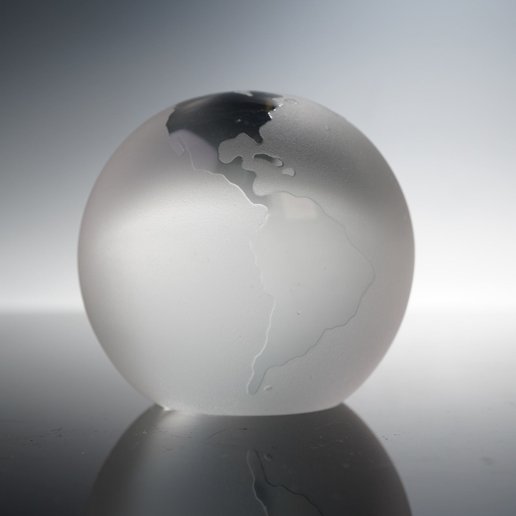 A finely crafted crystal world globe paperweight featuring frosted continents against a polished clear surface. The spherical design captures light beautifully, highlighting the etched map details. Unmarked.