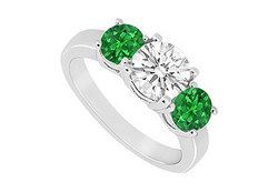 Two vibrant frosted emeralds are prong-set beside a large white round cubic zirconia. These three stones are a symbol of your past present and the future. Made in .925 sterling silver rhodium this ring has a total gem weight (TGW) of 1.50 carats.