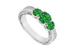 Three round frosted emerald are prong-set in the center of the ring. The band is intricately designed in .925 sterling silver rhodium. This three stone ring has a total gem weight (TGW) of 0.50 carat.