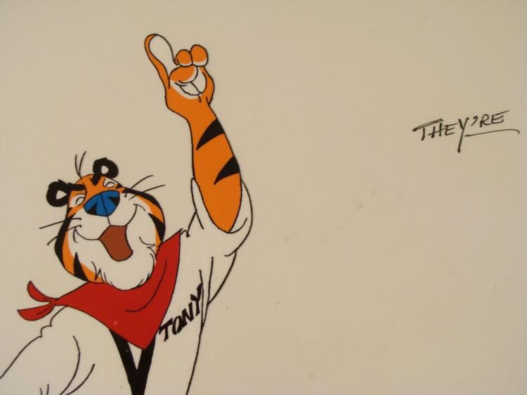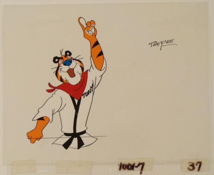 Frosted Flakes are more than good, They're GRRRREAT * * * Original Drawing and Animated Cel * Details: Animators notation at the bottomMedium: Hand painted cel acetateOverall Size of the Cels: 10 1/2" x 12 1/2" * Very good condition * * * This is an original hand-painted cel set-up used in the production of the "Frosted Flakes Commercial." Each one-of-a-kind set-up represents a slight change in position of the characters. When * individually photographed and projected in rapid succession, the images appear to move. * * To create production cels, the original animator's drawing is transferred onto an acetate cel (by hand-inking and/or photo copying). * * * *