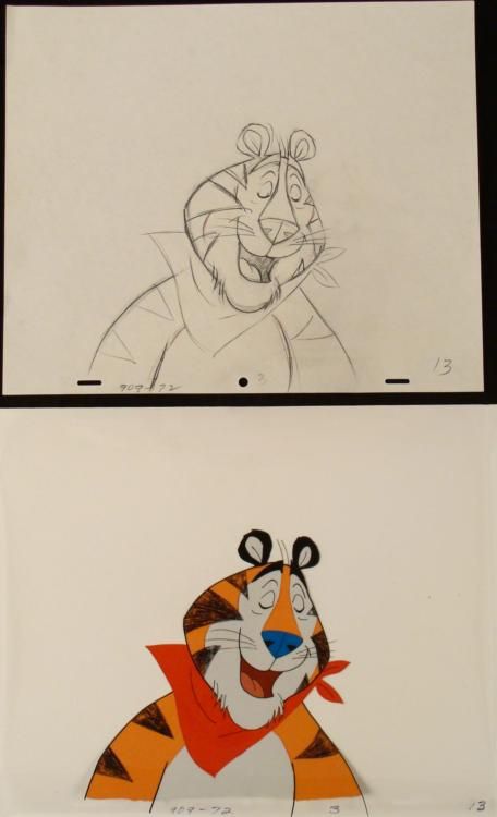 Frosted Flakes. They're Grrrrreat!!!! * * * Original Drawing and Animated Cel Original "rough" animation drawing, in red and black pencil. * * * Overall size is a 12-field drawing that is 10 1/2" × 12 1/2" * Ov