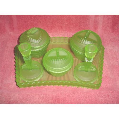 <tr><td>Title:Frosted Green Vanity Dresser Set.</td></tr>