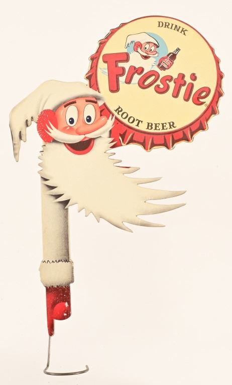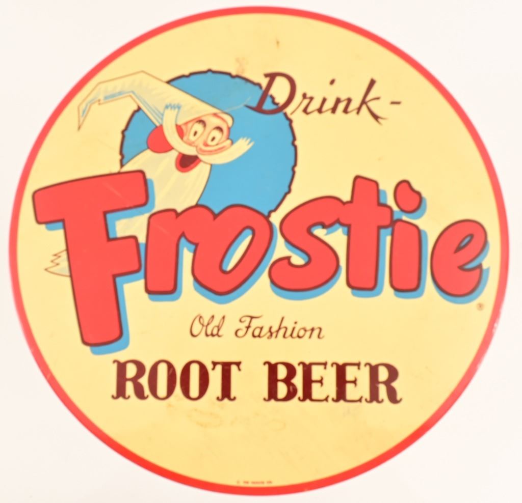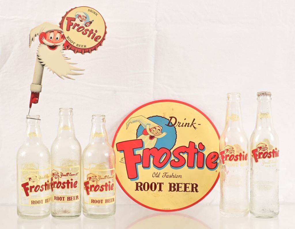 (5) Frostie Root Beer soda pop bottles 1950's. 1970's . (1) Advertisement bottle topper. (1) Drink Frostie Sign 9" diameter.