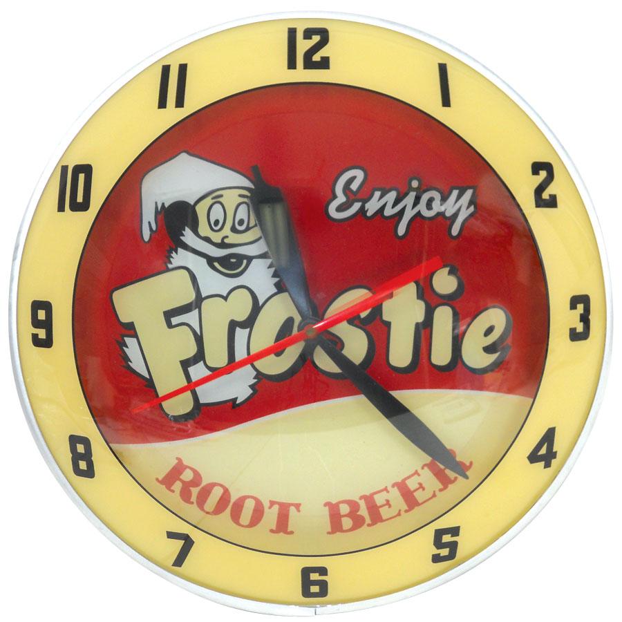 Frostie Root Beer light-up double bubble contemporary clock, a great looking newer clock in Exc working cond, 15"Dia.