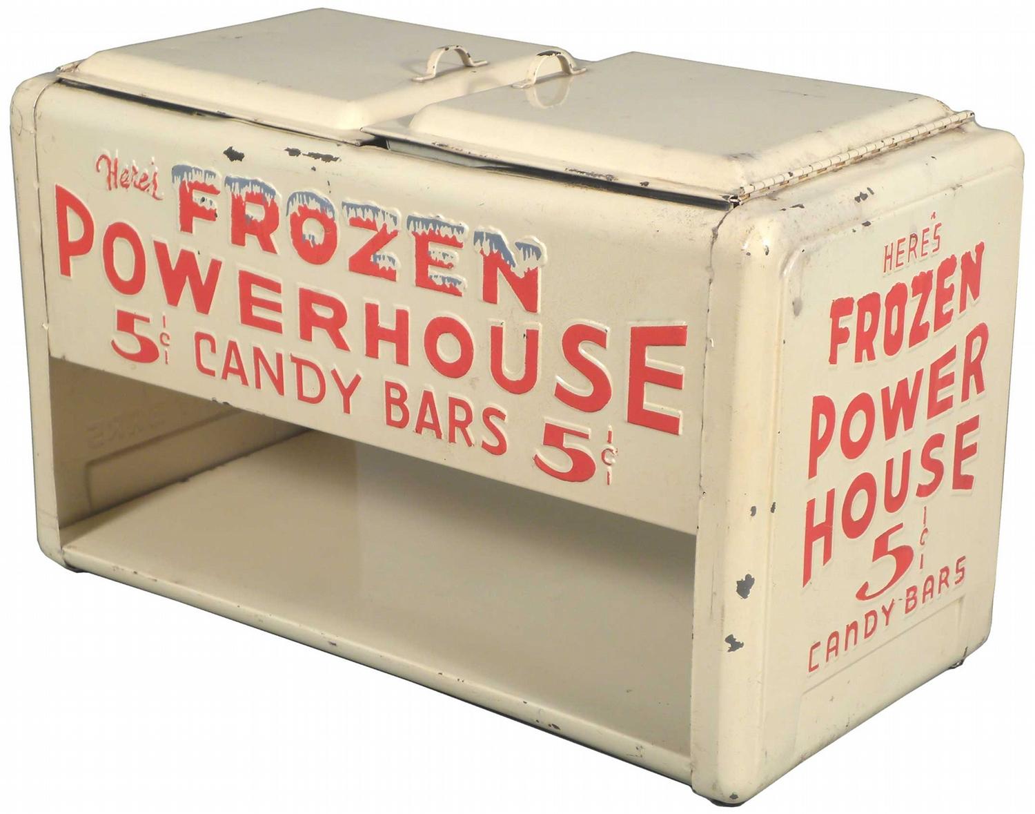 Frozen Powerhouse 5 Cent Candy Bars Functional Store Display Cooler. Pressed steel. Some minor paint los near top center on both sides otherwise excellent condition. 15 X 9 1/2 X 7 3/4 inches.