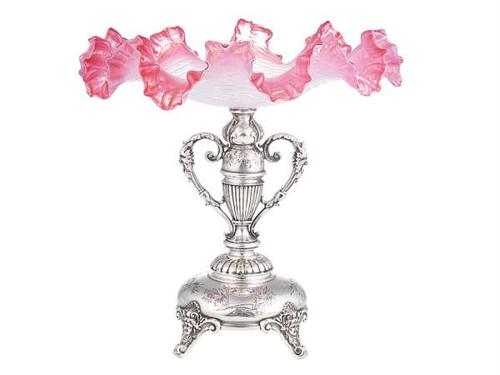 Silver, 164 g. Pressed base with masks and engraved decoration. Soldered. Blown opaque-rose colour glass bowl. Marked: Austrian, late 19th century, Gedlitzka & Söhne. Neuwirth: I/203. Size: 26 cm