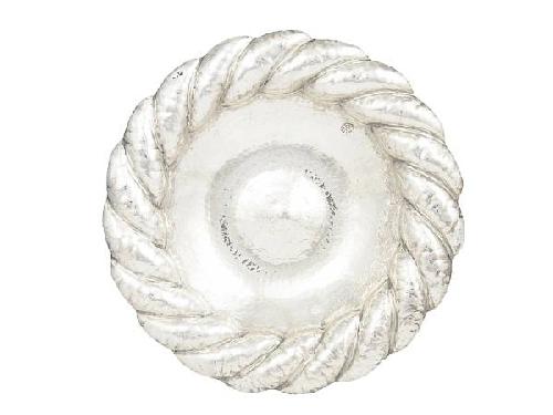 Silver, 395 g. round, chased bowl with braided rim, raised on three supports. Marked: Hungarian, circa 1940 Diameter: 27 cm