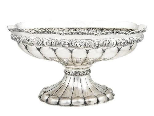 Silver, 1224 g. Oval, fluted base and body with garland decoration. Marked: Hungarian, circa 1940 Size: 39 x 25 cm