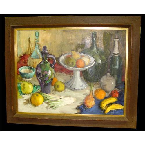 Signed H. Leegers, lower right colorful impressionistic depiction of a hearty table filled with fruits vegetables and wine in is original parcel gilt wood frame and which would make a great gift or addition to any fine household.