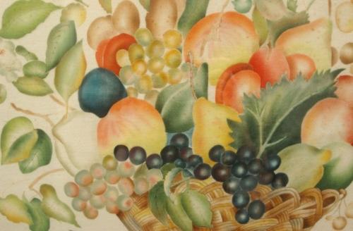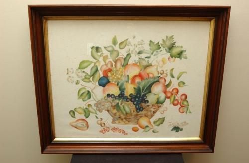 Meyer, Polly (American 20th Century) Painting on velvet of fruit bowl in antique wooden frame with bird, minor age spots on velvet, ca. 1960's.19 1/2" by 24"