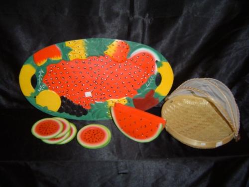 Hand Painted Fruit Tray with Netted Basket, Napkin Holder, Eight Coasters -- Watermelon Theme. Tray 20"X11.25", 11" Basket