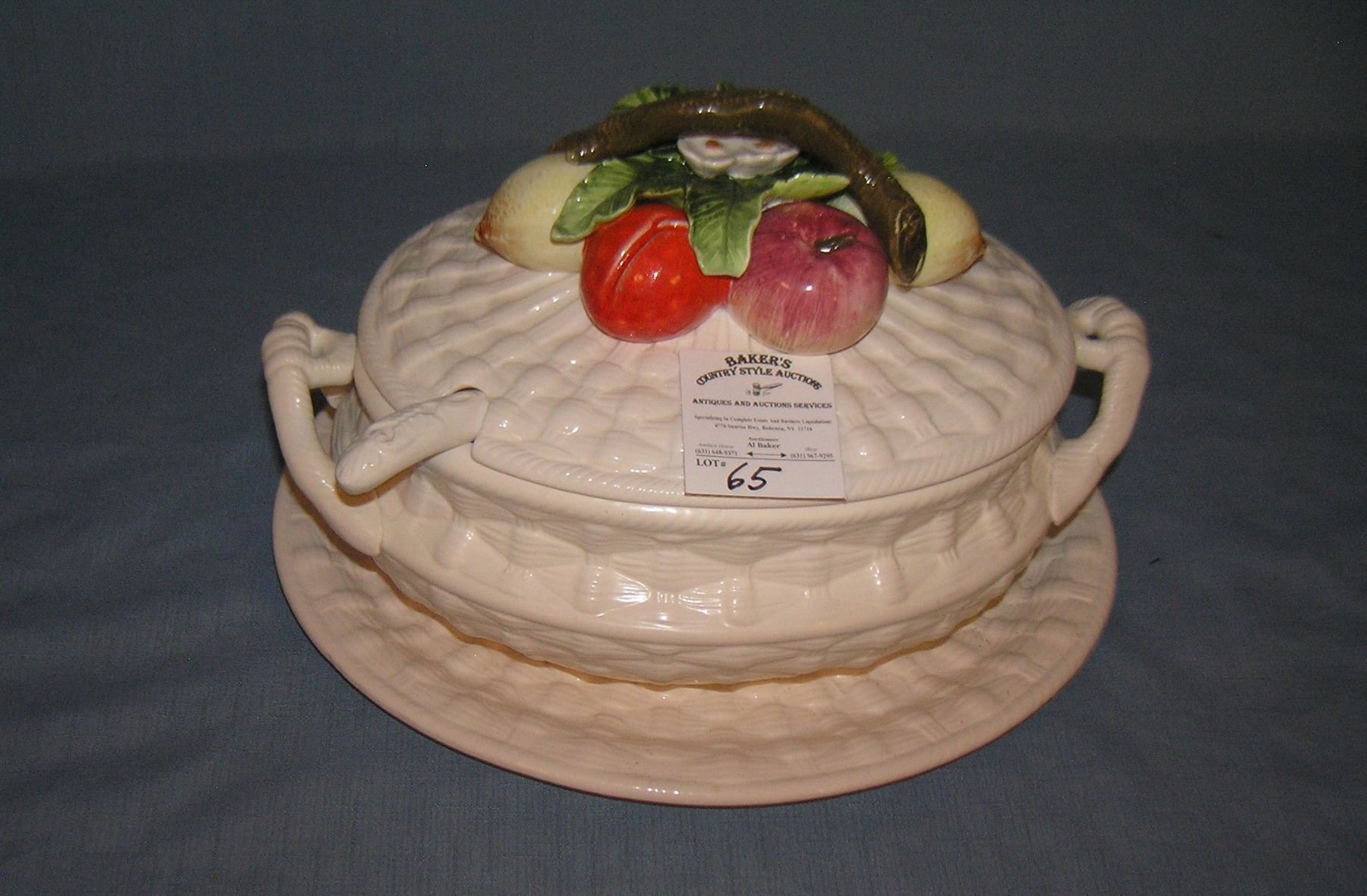 Fruit decorated soup tureen and platter est. value $75.00-80.00