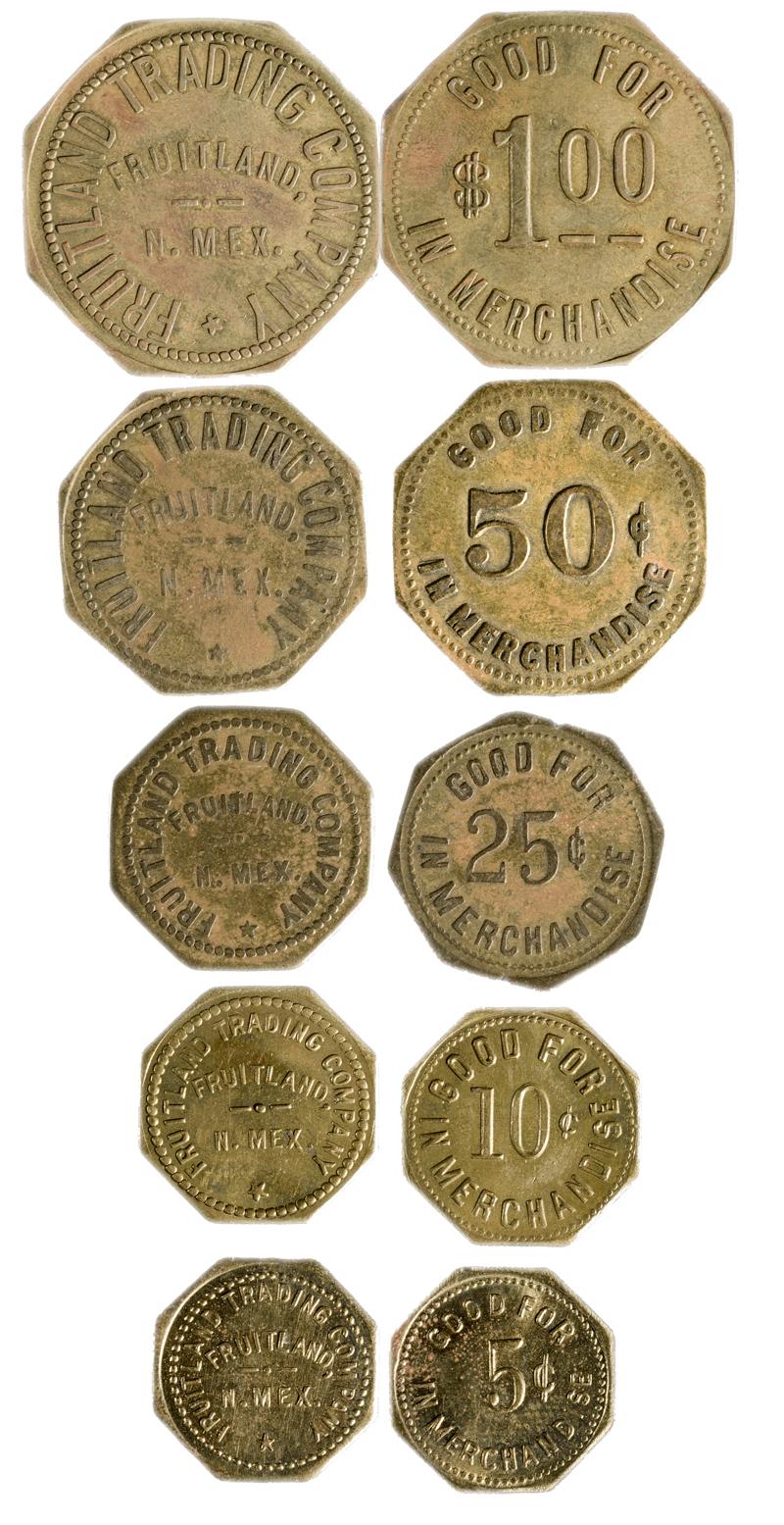 Five tokens: Obverse: Fruitland Trading Company / Fruitland / N. Mex.; reverse: Good For / 5c,10c,25c,50c,$1.00 / In Merchandise. Br, oc, 21-33mm,R8. Fine through extremely fine condition. Once called Olio, it's located on U.S. 550. 10 miles west of Farmington.