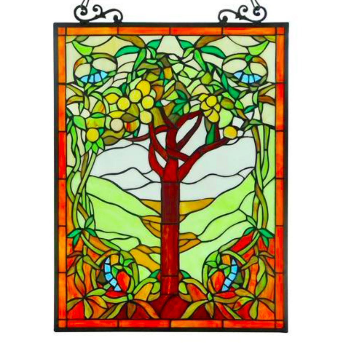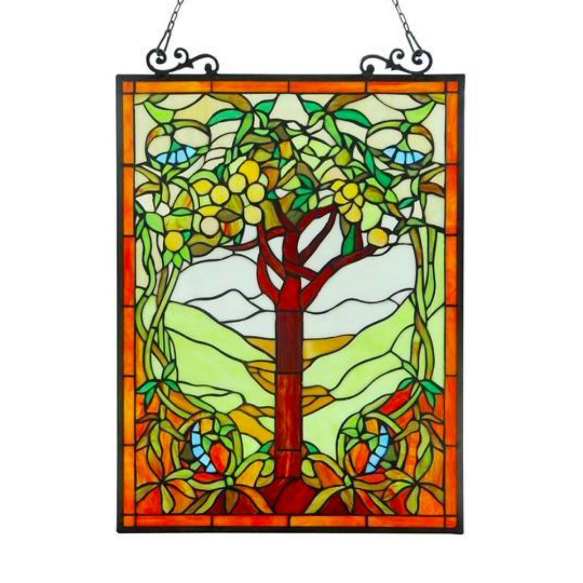 Fruits of Life stained art glass hanging window panel, created using 470 pieces of stained art glass, wrapped in copper foil. 25" H X 18" W. Comes with hanging chain.Â