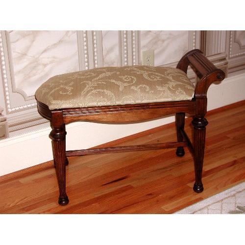 C.1900 Empire aged walnut vanity bench has one back handle,beautifully curved and grooved as are the straight legs. Unique rounded front makes this piece perfect for many places. Scalloped apron. Superior craftsmandship. Covered in light gold on gold brocade which is well padded and crowned,sturdy and comfortable. Under support bar. Excellent condition. Measures 30L X 21H X 16D.Co-ordinates well with several vanities and desks in my shop.A search can be done in these catagories.