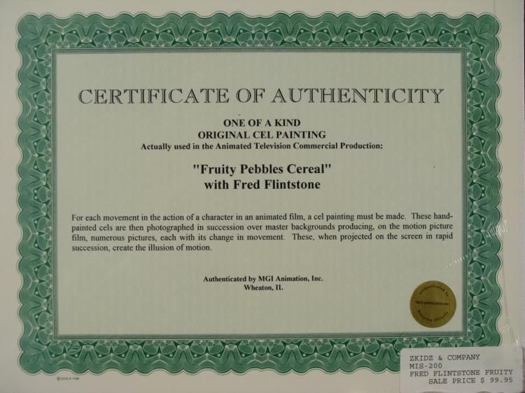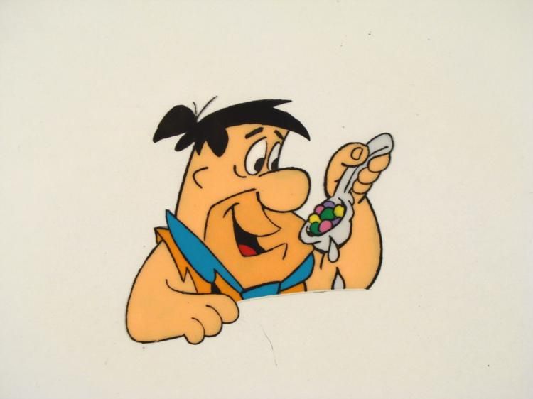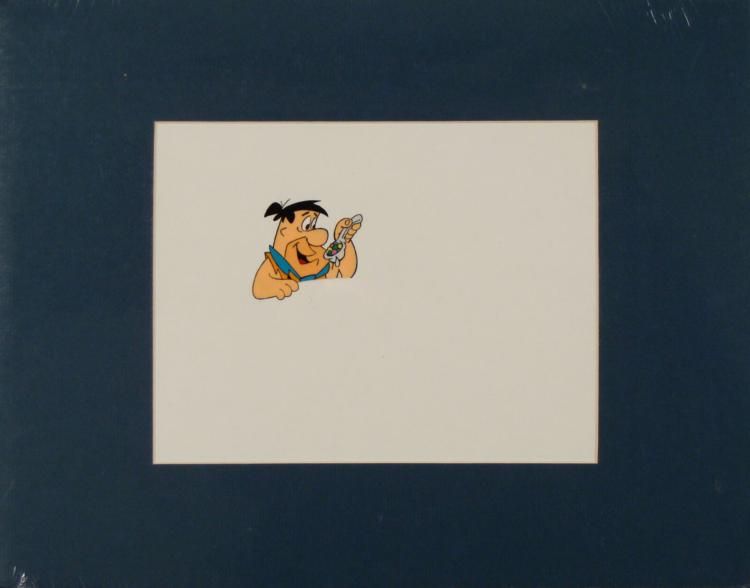 This is an original animation cel used in the production of a Fruity Pebbles cereal commercial, featuring Fred Flintstone. Fred is scooping up a big spoonful of his Fruity Pebbles and milk, ready to enjoy his complete breakfast. * Medium: Hand-inked and hand-painted acetate celImage size: 10 1/4 x 8 inchesPresentation: Matted in blueMatte size: 17 3/4 x 14 inchesCondition: Excellent; sealed in cellophaneCertificate of Authenticity: Included