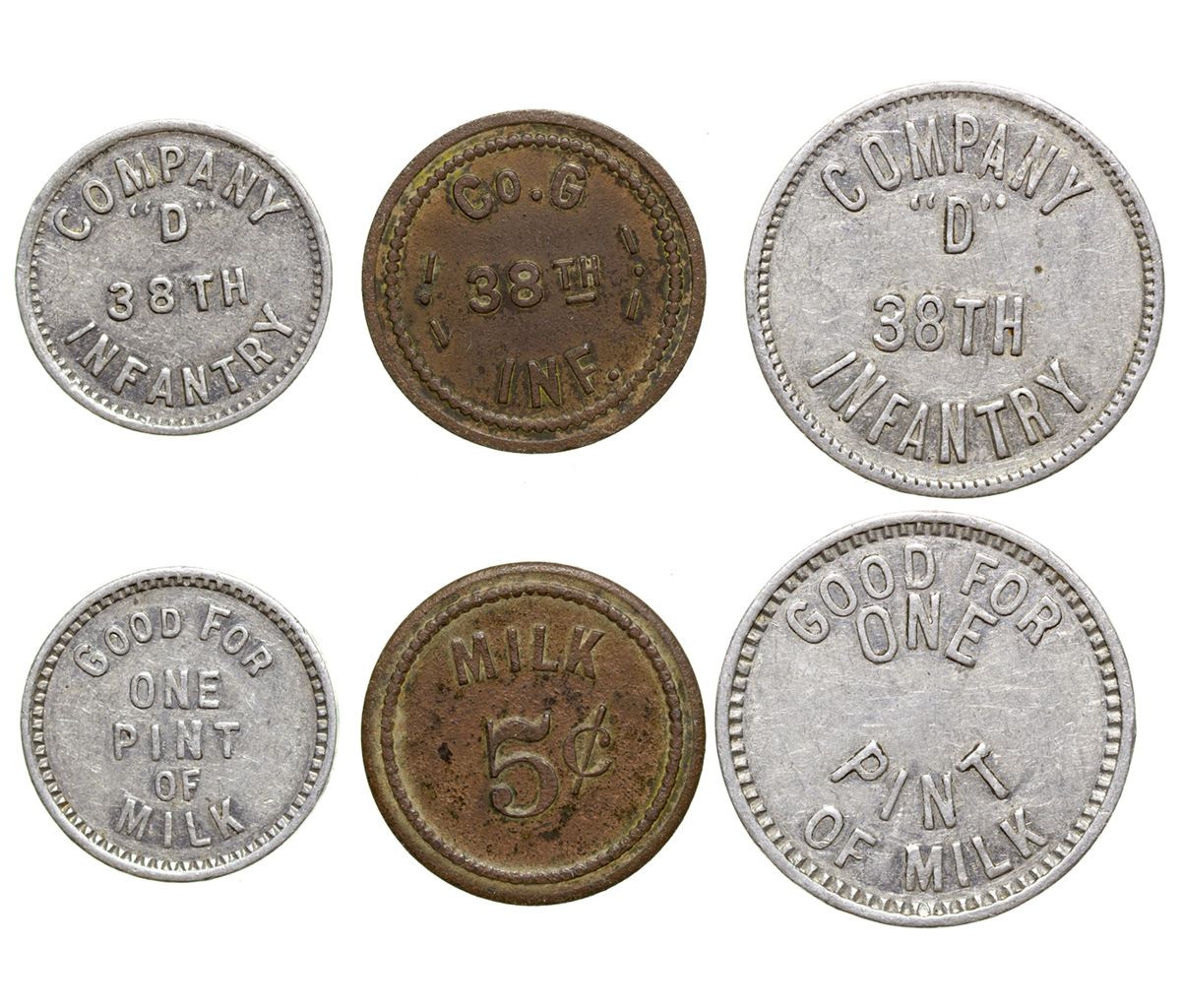 Lot of 3 38th Infantry tokens, including 1) Round aluminum 29mm COMPANY D INFANTRY, Good for One Pint of Milk. Condition VF. 2) Round aluminum 31mm, COMPANY D INFANTRY, Good For One Pint of Milk. Condition VF. 3) Round brass 30mm. CO. G 38TH INF. Good for 5 cents. Condition G. -61411