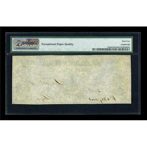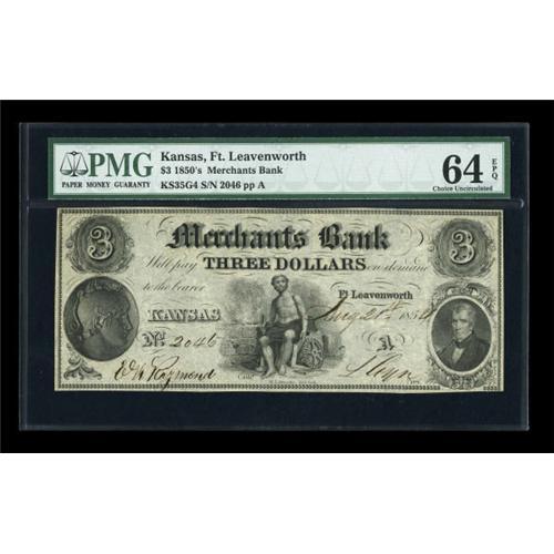 <B>Ft. Leavenworth, KS- Merchants Bank </B></I>$3 Aug. 21, 1854 KS35 G4.<BR> An attractive, fully issued note with bold signatures, date, and serial number. <B>PMG Choice Uncirculated 64 EPQ.</B></I><BR><BR><b>Shipping:</b> Coins & Currency (<a target="_blank" href="http://www.heritageauctions.com/common/shipping.php">view shipping information</a>)
