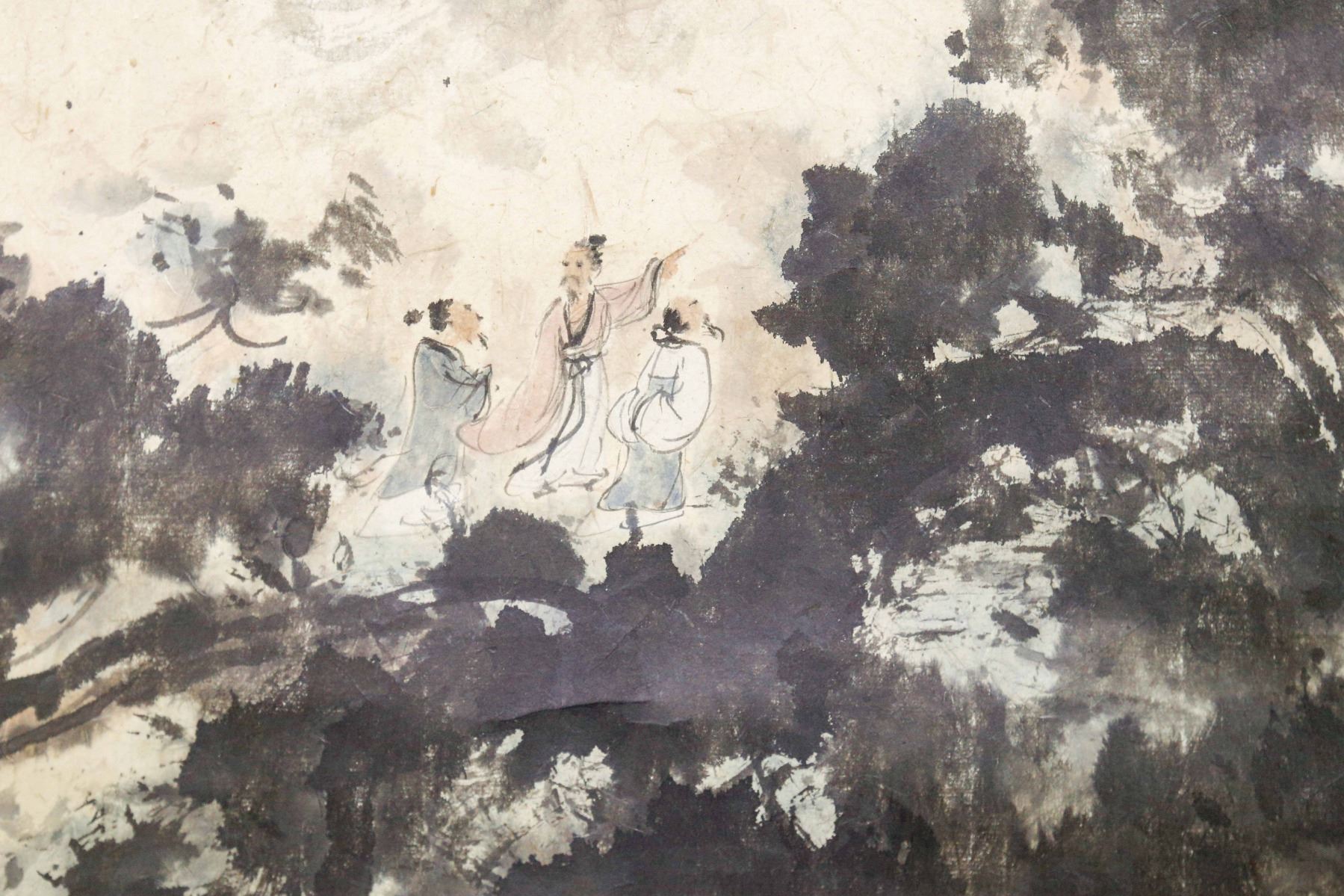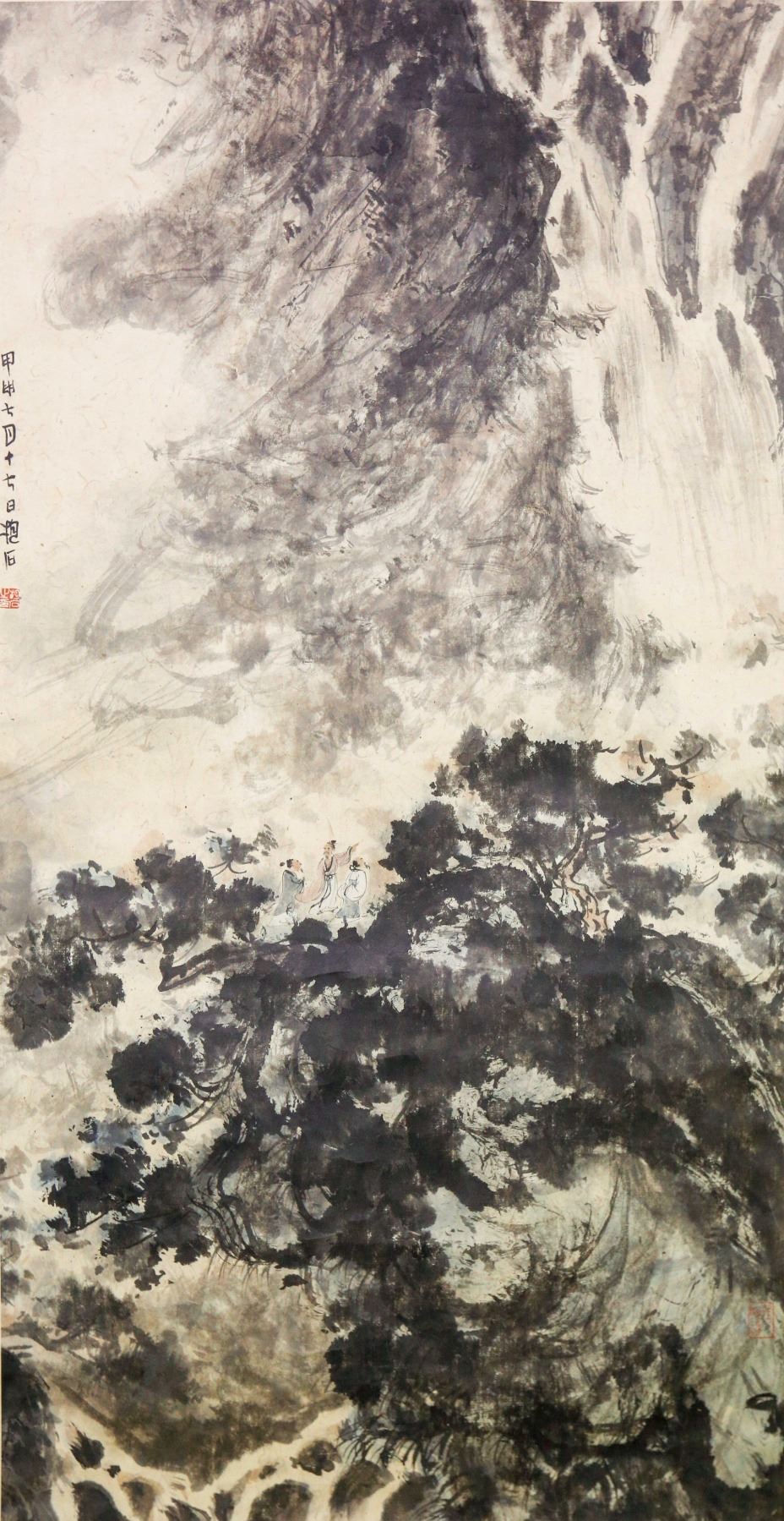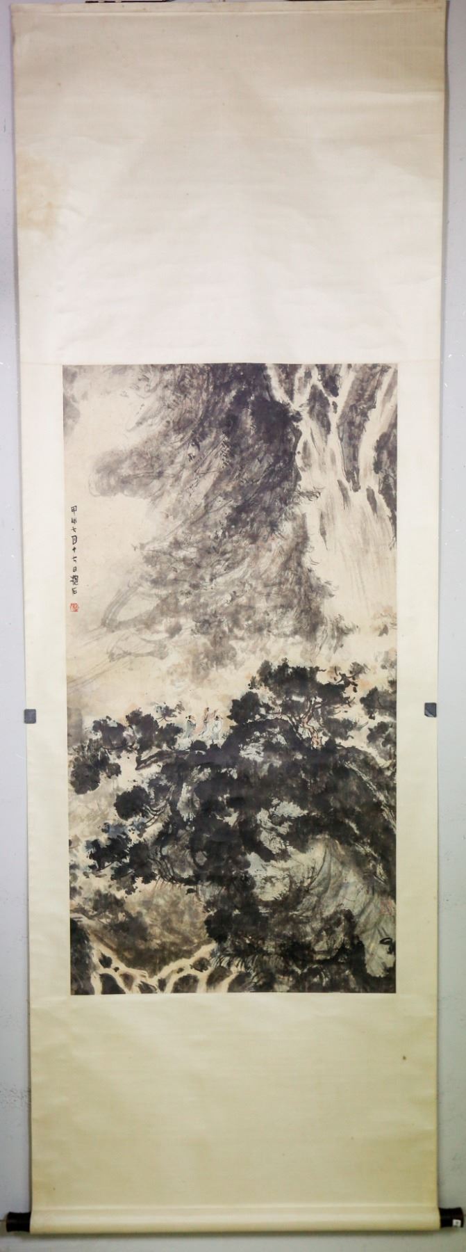 Ink and watercolour on paper; hanging scroll. Featuring landscape scene of forest and figures. Signed Fu Baoshi 1904-1965 Chinese, inscribed with two artist seal. 110 x 57 cm. PROVENANCE: Acquired by the current owner in Nagoya, Japan (Circa 1980).