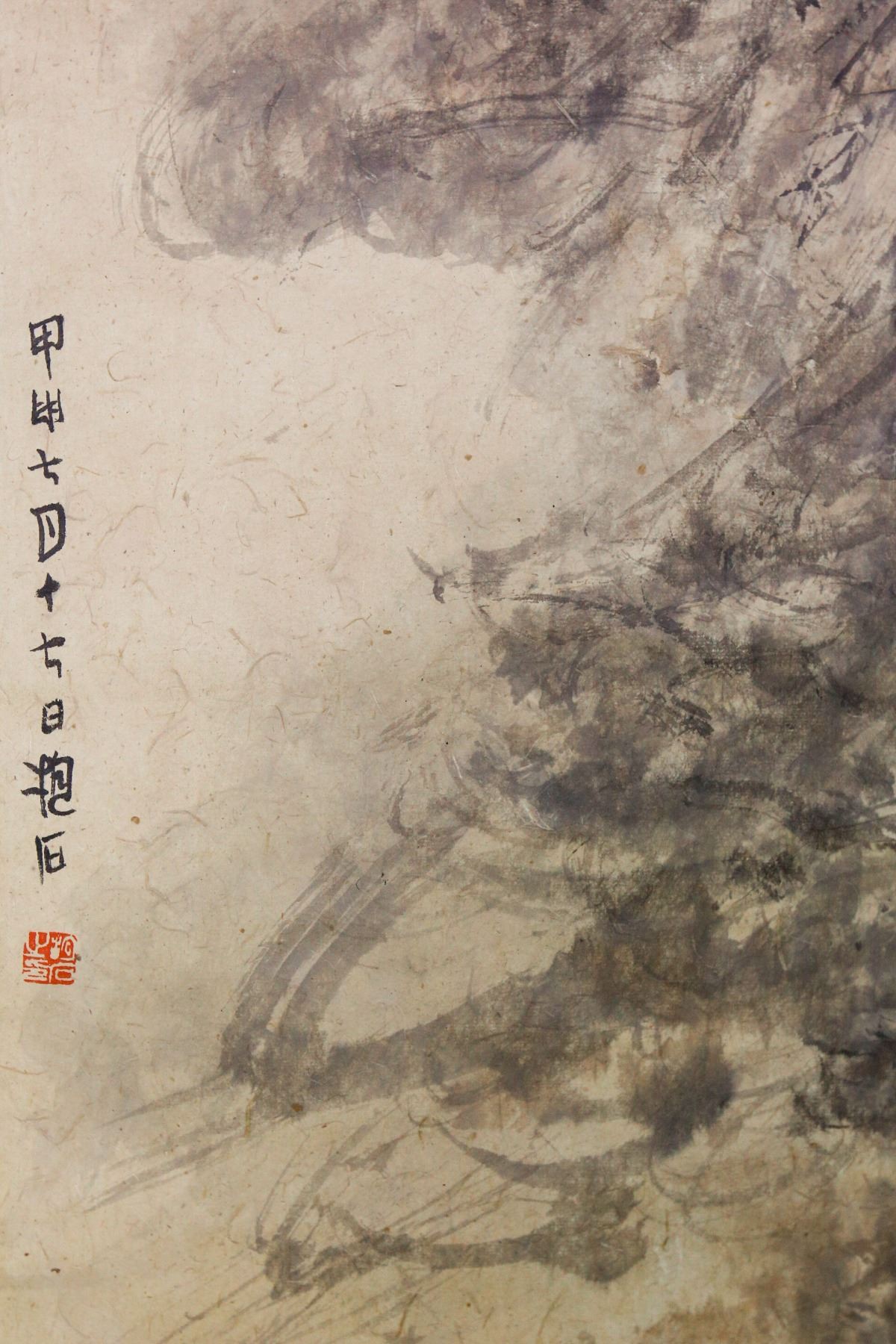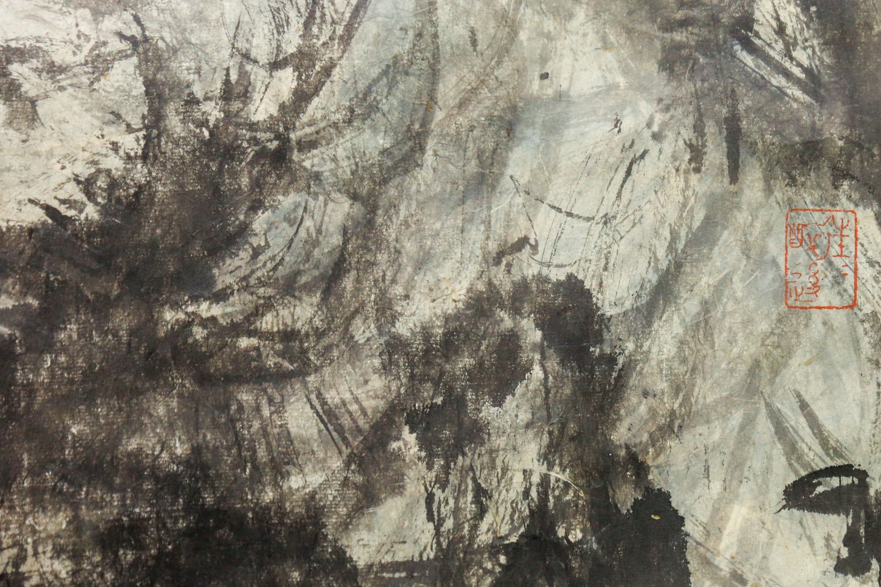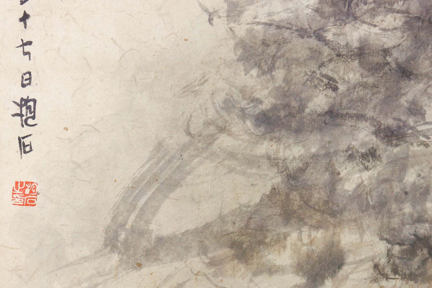 Ink and watercolour on paper; hanging scroll. Featuring landscape scene of forest and figures. Signed Fu Baoshi 1904-1965 Chinese, inscribed with two artist seal. 110 x 57 cm. PROVENANCE: Acquired by the current owner in Nagoya, Japan (Circa 1980).