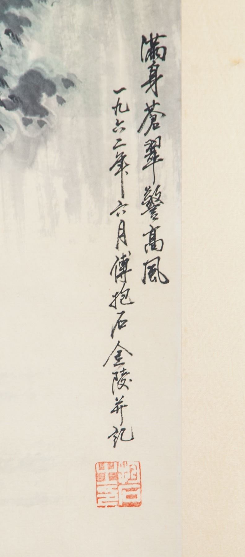 Watercolor and ink on paper, featuring mountainous landscape, signed and attributed to Fu Baoshi (1904-1965, Chinese), inscribed with 1 artist seal, 96 x 47.5 cm, Fu Baoshi was a Chinese painter known for both his depictions of landscapes and figures. In his devotion towards painting landscapes, Fu expressed himself with distinctive brushstrokes and splattered marks. During his career, Fu’s subject matter changed from traditionally dressed figures in misty forests to power lines and airports. Today, Fu’s works are held in the collections of the Metropolitan Museum of Art in New York, the Long Museum in Shanghai, and the Cleveland Museum of Art, among others.
