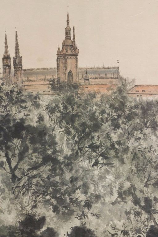 Landscape of Prague city; Chinese ink and watercolour on paper; hanging scroll; signed Fu Baoshi (1904-1965); inscribed with 2 artist seals; 140 cm x 72 cm