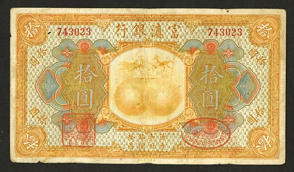 China, $10, P-S3016a, S/M#Y70-22, Issued banknote, orange-yellow on m/c underprint, globes in middle, back green, Choice Fine with light stains, still bright colors. ABNC.
