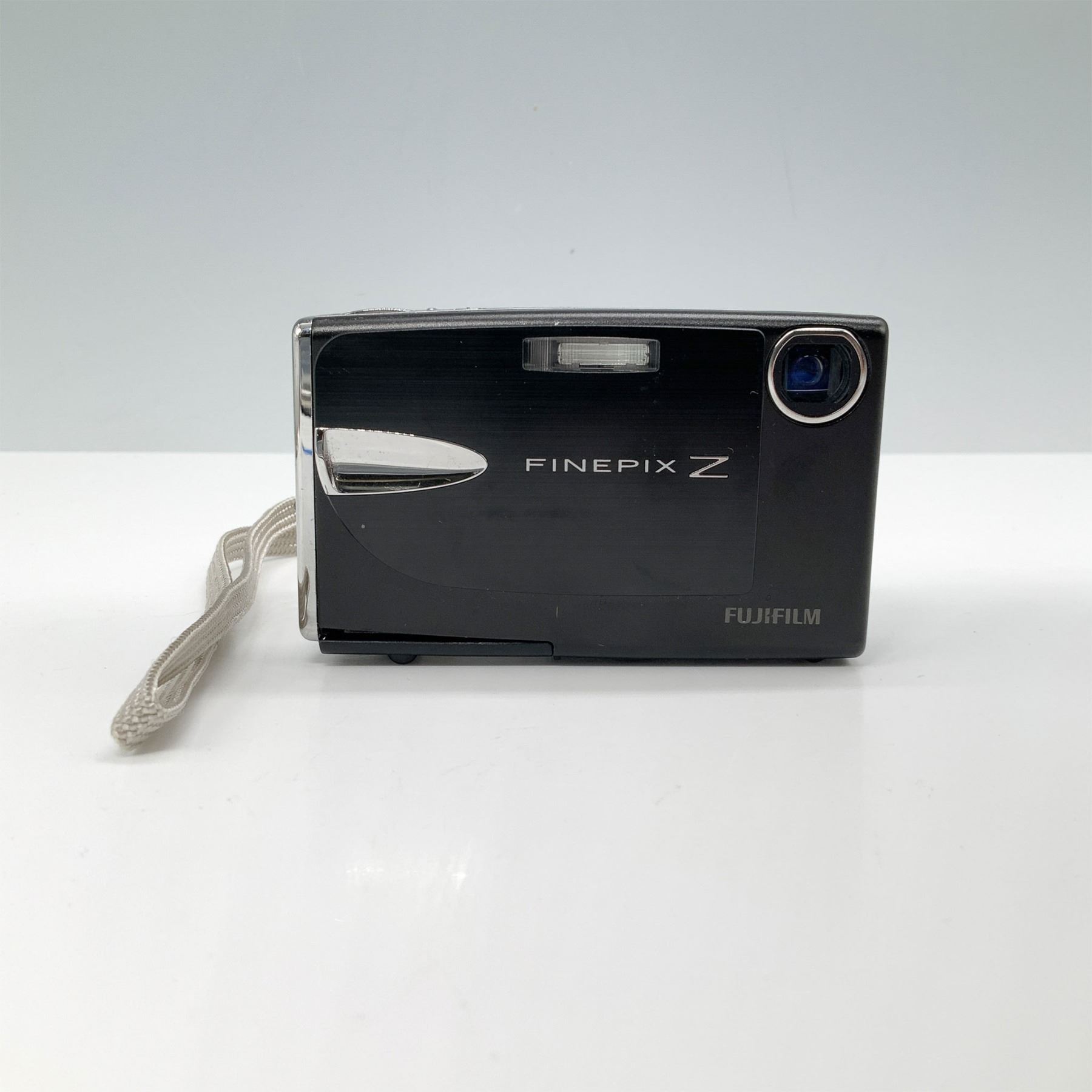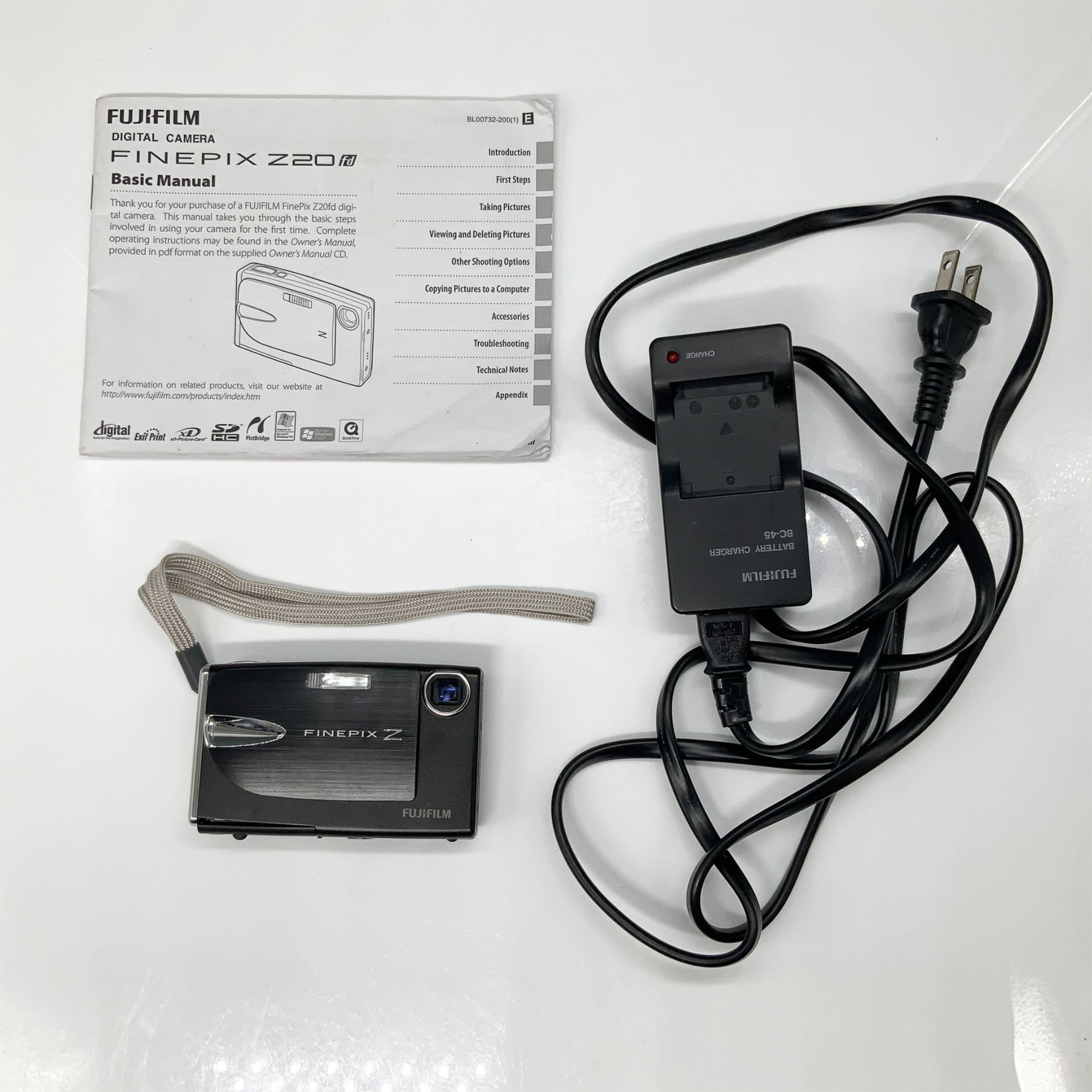 This Fujifilm FinePix Z20fd digital camera features a sleek black design and is equipped with a 3x Fujinon optical zoom lens. The camera supports MPEG-4 movie recording and includes a built-in flash. The lot also comes with the original manual, two software discs (for both camera software and a digital imaging sensor), and a charging dock. The camera is compact, making it a convenient choice for everyday photography.