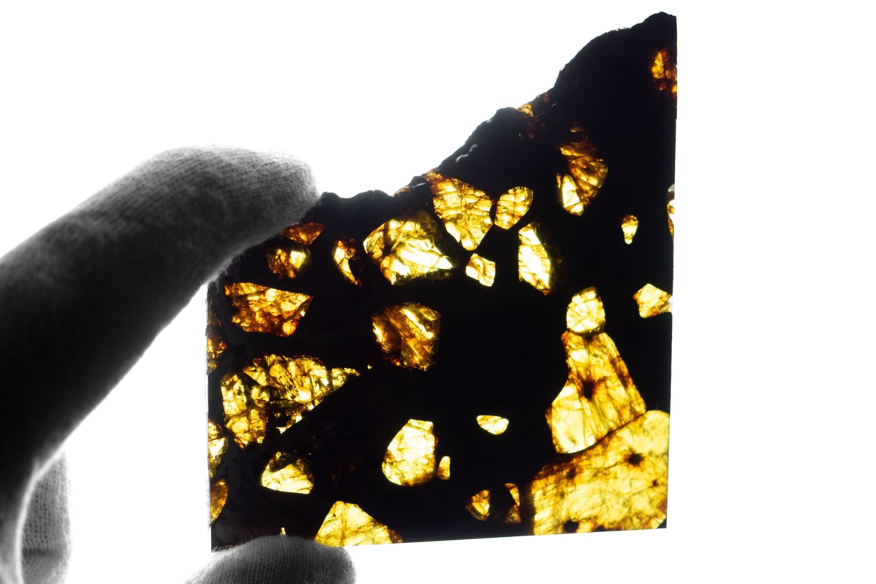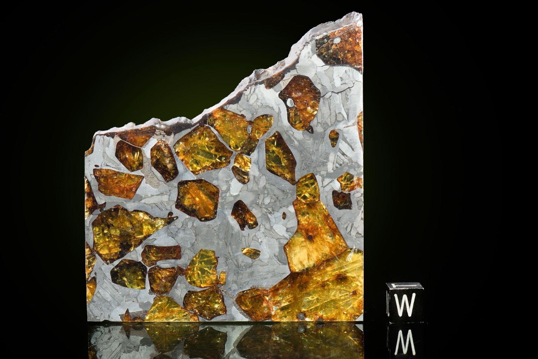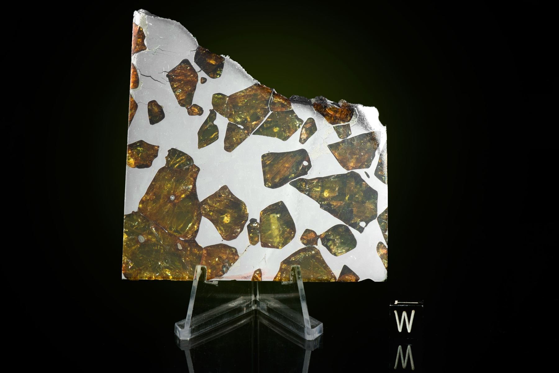 Beautiful Fukang pallasite meteorite partial slice, characterized by extraordinarily large and colorful olivine crystals (also known as extraterrestrial peridot). Etched and polished on both faces, the partial slice weighs 77.6 grams and measures approximately 80 mm x 87 mm x 2 mm. The main mass was discovered in 2000 in Xinjiang Province, China, and this meteorite has rapidly become a favorite among collectors due to the stunning and enormous olivine crystals. The absolute finest display piece. Accompanied by a certificate of authenticity signed by Geoff Notkin of Aerolite Meteorites Inc. and the TV show Meteorite Men, as well as a specimen identification card.