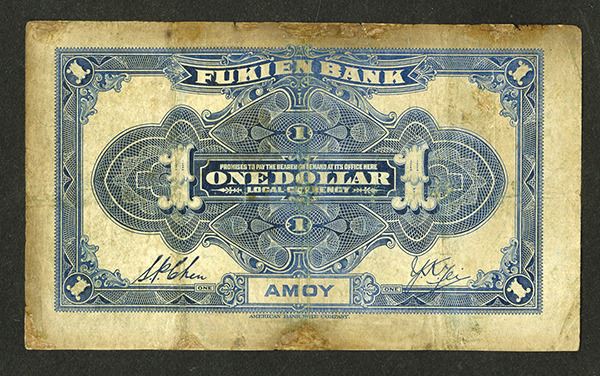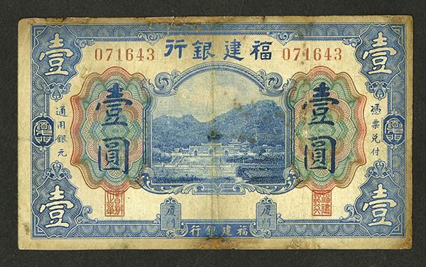 Amoy, China. ND (1915), $1, P-S1435, (S/M #F31-1), Issued banknote, blue on m/c, village and mountain scene, back blue. The note has toning on the margins, a small tear on the top middle margin and possibly a minor repair on the bottom middle, but overall the note is intact and still has firm paper quality and would grade Fine to Fine+ with small faults, this note is more difficult to find issued. Scarce and attractive example of this rare note. ABNC.