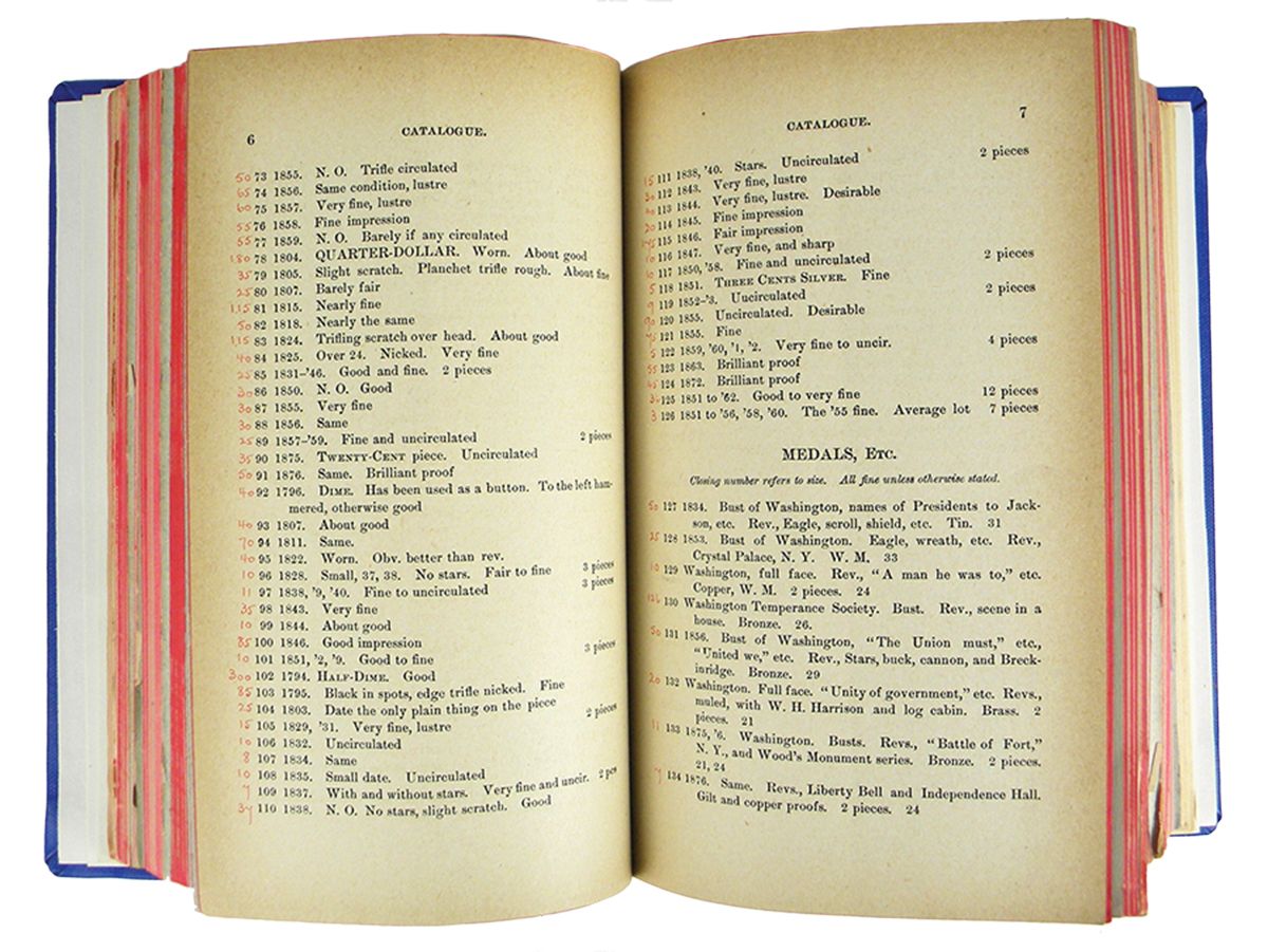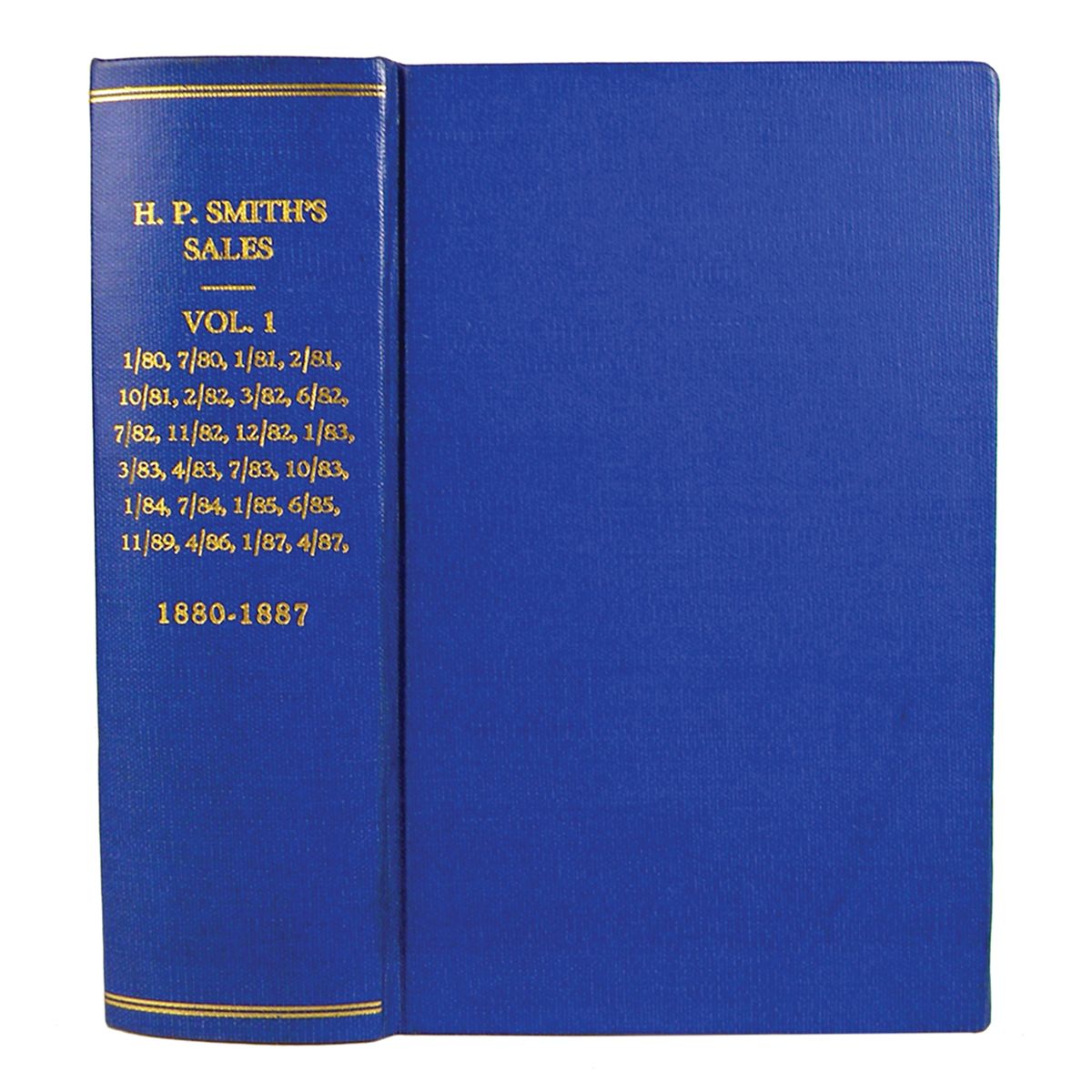 Smith, H.P., and H.G. Sampson. AUCTION SALES. New York, 1880-81. Four catalogues. Adams Nos. 1-4, complete. Handpriced throughout. [bound with] Smith, H.P. AUCTION SALES. New York, 1881-87. Twenty catalogues. Adams Nos. 1-18, 20 and 21. All but the last two neatly handpriced. Twenty-four catalogues in all, bound in one volume. Thick 8vo, modern blue cloth, gilt; original printed paper or card covers bound in throughout. Fine. Ex libris Melvin and George Fuld; ex November 27-28, 1971 Katen Fuld sale, lot 1417; ex libris Harry W. Bass, Jr. (June 10, 2000 Kolbe Bass Sale Four, lot 506); ex Craig Smith. The 1883 Historical Collection and the 1885 Stewart Douglas both include the rare plates. Except for the large format 1886 Maris sale, a complete run of Smith/Sampson and H.P. Smith sales, nearly all neatly handpriced. Ex Kolbe Sale 95, lot 188. Ex Dave Steine library.