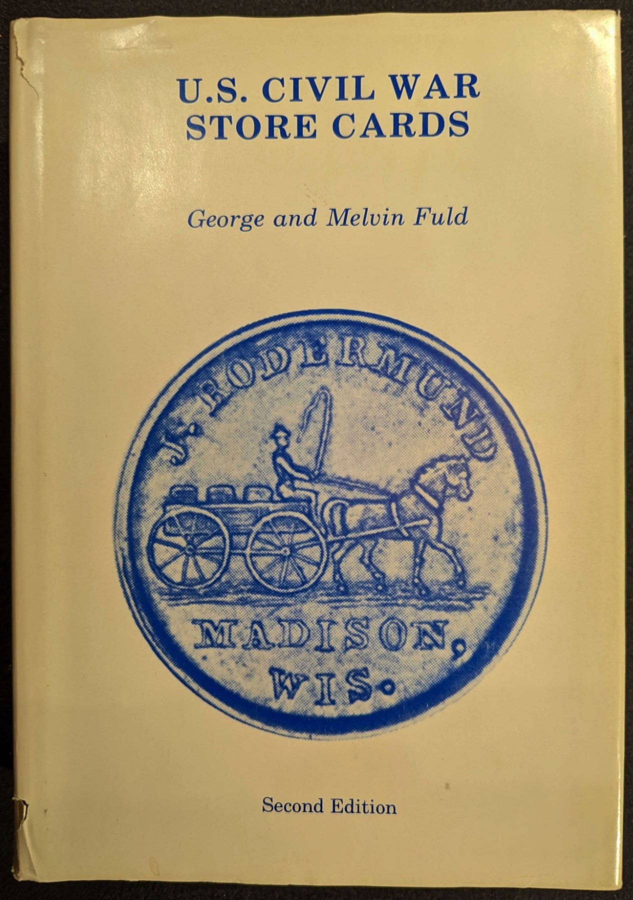 Fuld, George & Melvin Fuld. US CIVIL WAR STORE CARDS. Quarterman Publications, Inc. 1975. 8vo. (4), vi, (2), 615, (1), 30 pages. Lawrence. Original blue cloth, lettered in silver, dust jacket. b&w plated throughout. Fine. This book is a guide to the identification of US Civil War Store cards. It provides the listing of over 8,400 different pieces, containing new merchants, new obverse and reverse dies, new metal and edge varieties, and many more. Photos of these merchants and dies, reverse die proofs, die conversion tables, and an alphabetical index are included in this work. At the end of the book is a catalog, compiled by Jeff Harris, of unlisted Civil War store cards in the collection of the American Numismatic Society. Lot weight: 2 lbs 9oz. Subject(s): United States Tokens.