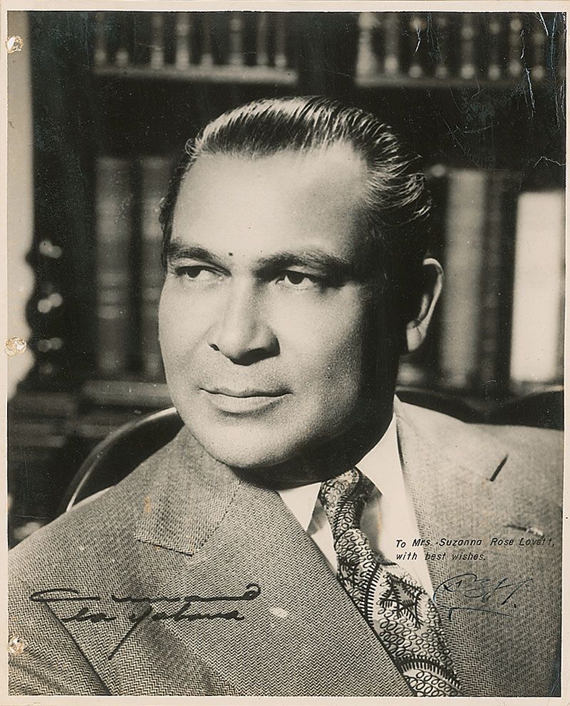 Leader of Cuba (1901–1973) who was in office from 1940 to 1944 and from 1952 to 1959, at which time he was overthrown by Fidel Castro. Vintage glossy 8 x 10 photo, inscribed in type to “Mrs. Suzanna Rose Lovett, with best wishes,” and signed underneath in fountain pen. Photo also bears a short pre-printed sentiment in the lower left. In very good condition, with punch holes to left edge, scattered creases and surface marks, some silvering to darker areas, and a bit of irregular ink adhesion to signature. Accompanied by a 1954 TLS from Batista’s offices in Cuba.