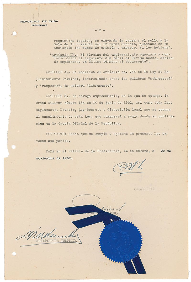 Leader of Cuba (1901–1973) who was in office from 1940 to 1944 and from 1952 to 1959, at which time he was overthrown by Fidel Castro. DS, in Spanish, three pages, 9 x 13.5, November 22, 1957. Untranslated “Law No. 14,” signed at the conclusion by Batista and countersigned by his minister of justice. In very good condition, with paper loss to left edge of all three pages. The blue seal is intact and retains its original blue ribbon.