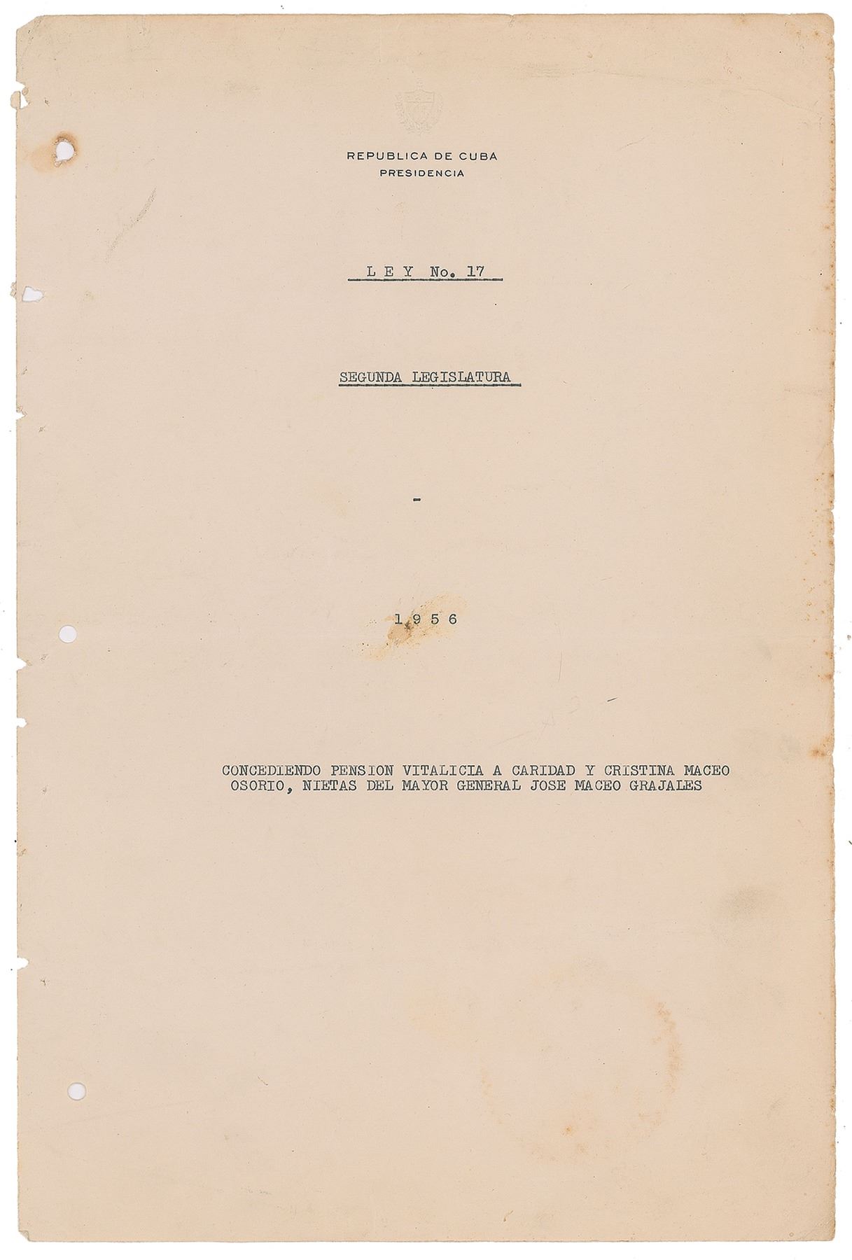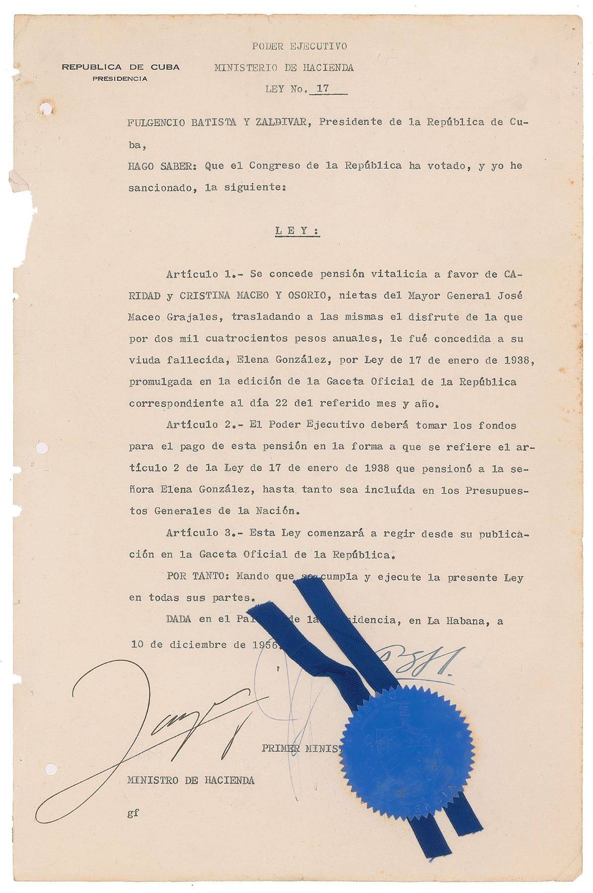 DS in Spanish, two pages, 9 x 13.75, December 10, 1956. Partially translated document issuing a lifetime pension to Caridad and Cristina Maceo and Osorio, granddaughters of Major General Jose Maceo Grajales, transferring to them each "one thousand four hundred pesos per year," which was granted to his deceased widow, Elena Gonzalez. Signed at the conclusion by Fulgencio Batista as president of Cuba. Lower portion bears the original blue seal and ribbon. In very good to fine condition, with file holes, binding holes, and some paper loss along the left edge.