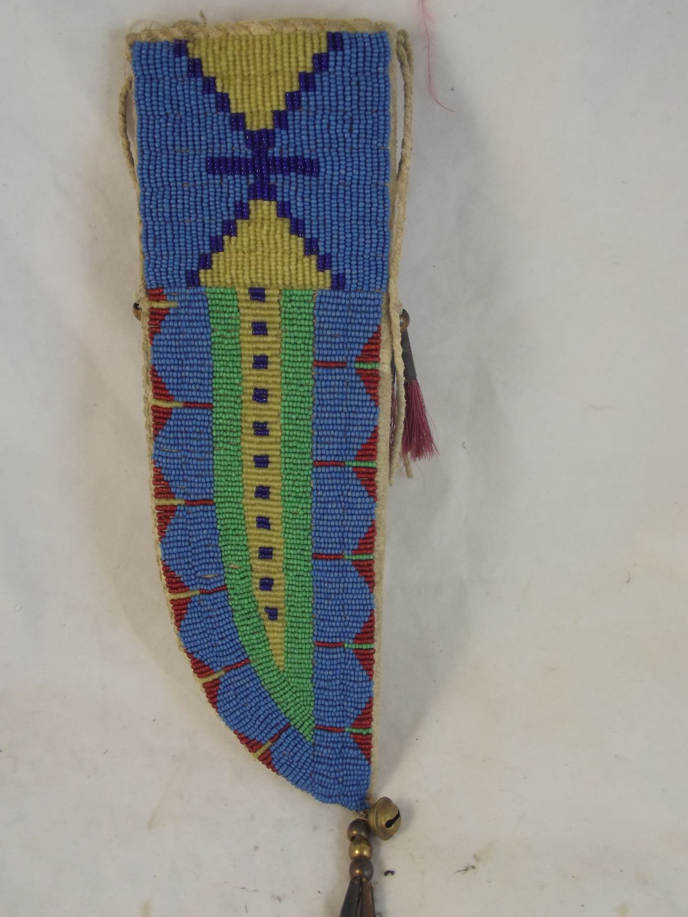 Full beaded Knife Case. Rawhide insert beaded on brain tanned buckskin. Tin cone drops. 10" x 3"