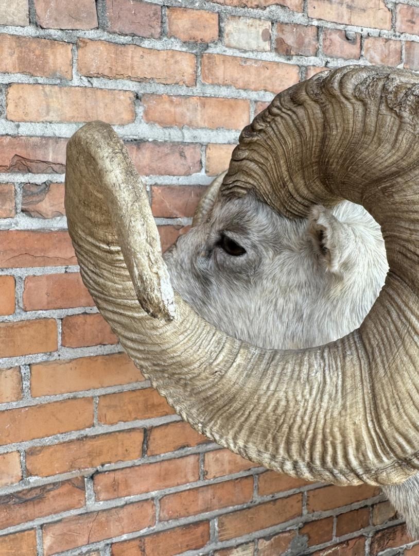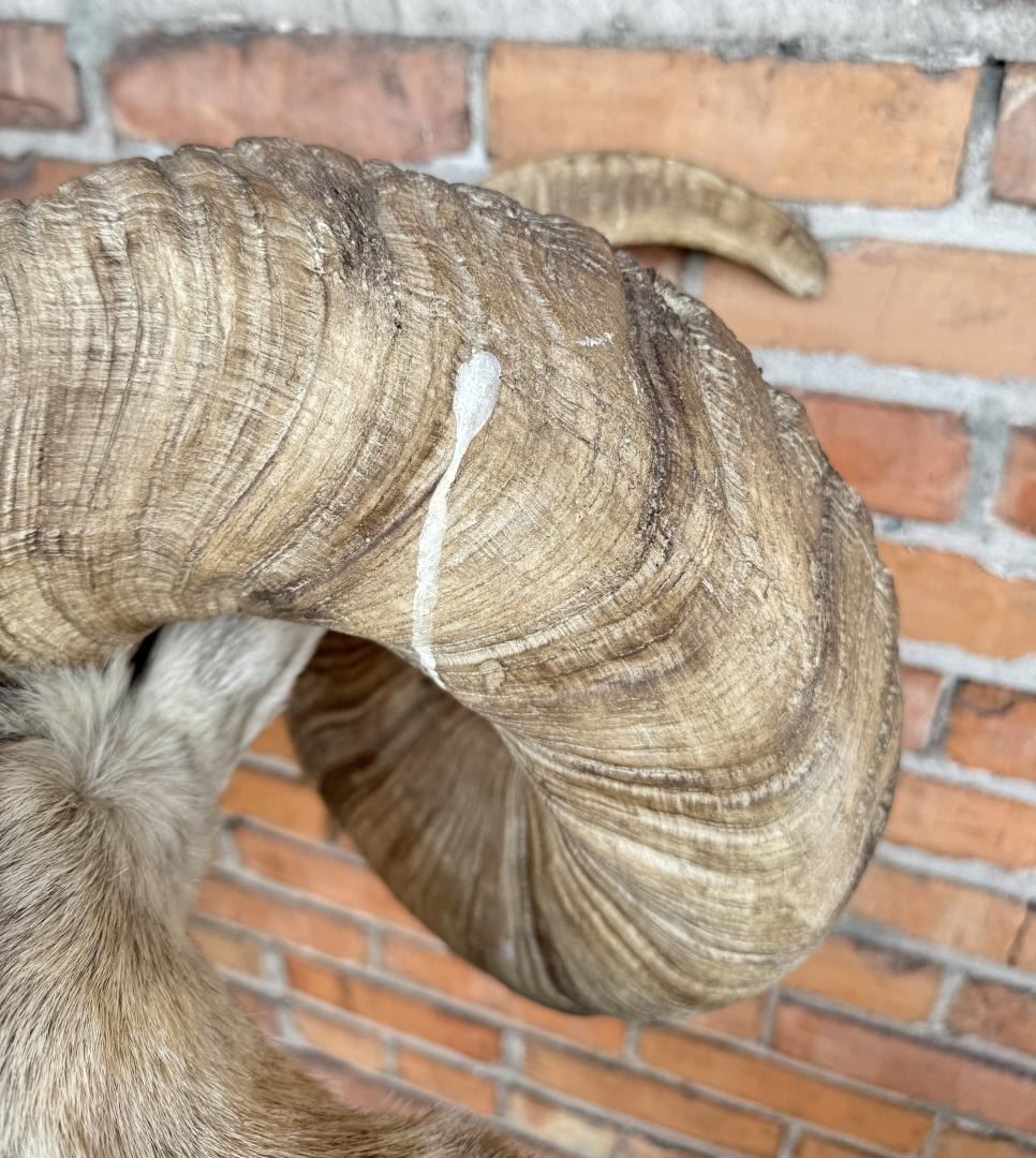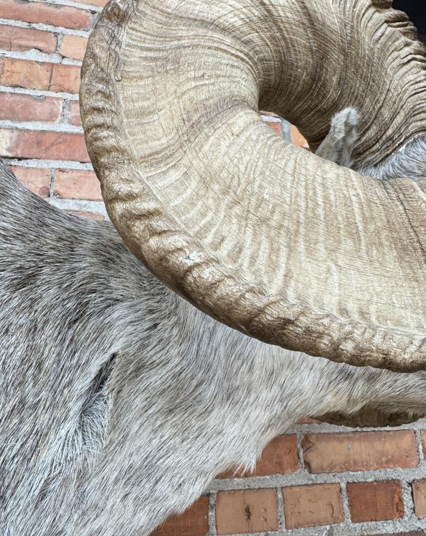 Mount measures 68 1/2" by 44" including mounting bolts. The horns are synthetic. This item requires shipment via LTL Carrier or Pickup at our facility. Provenance: The Estate of Sherwin Scott. This sheep was recorded as part of Scott's SCI Record Book 2nd Largest All Time Largest Grand Slam.