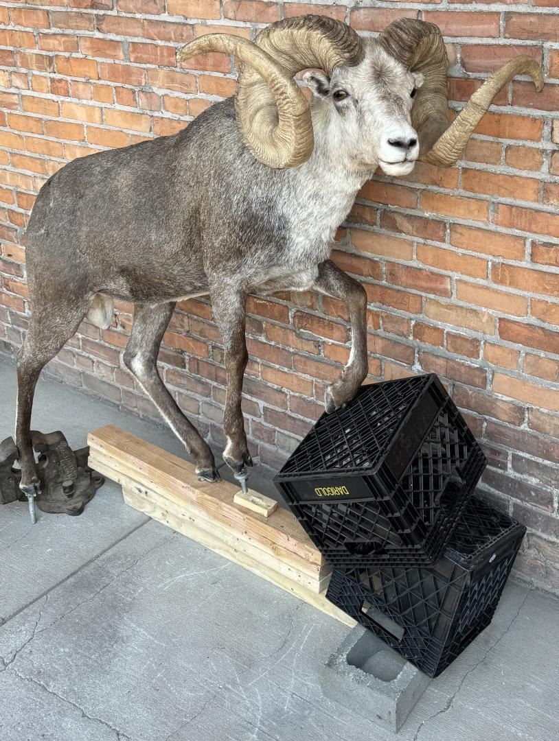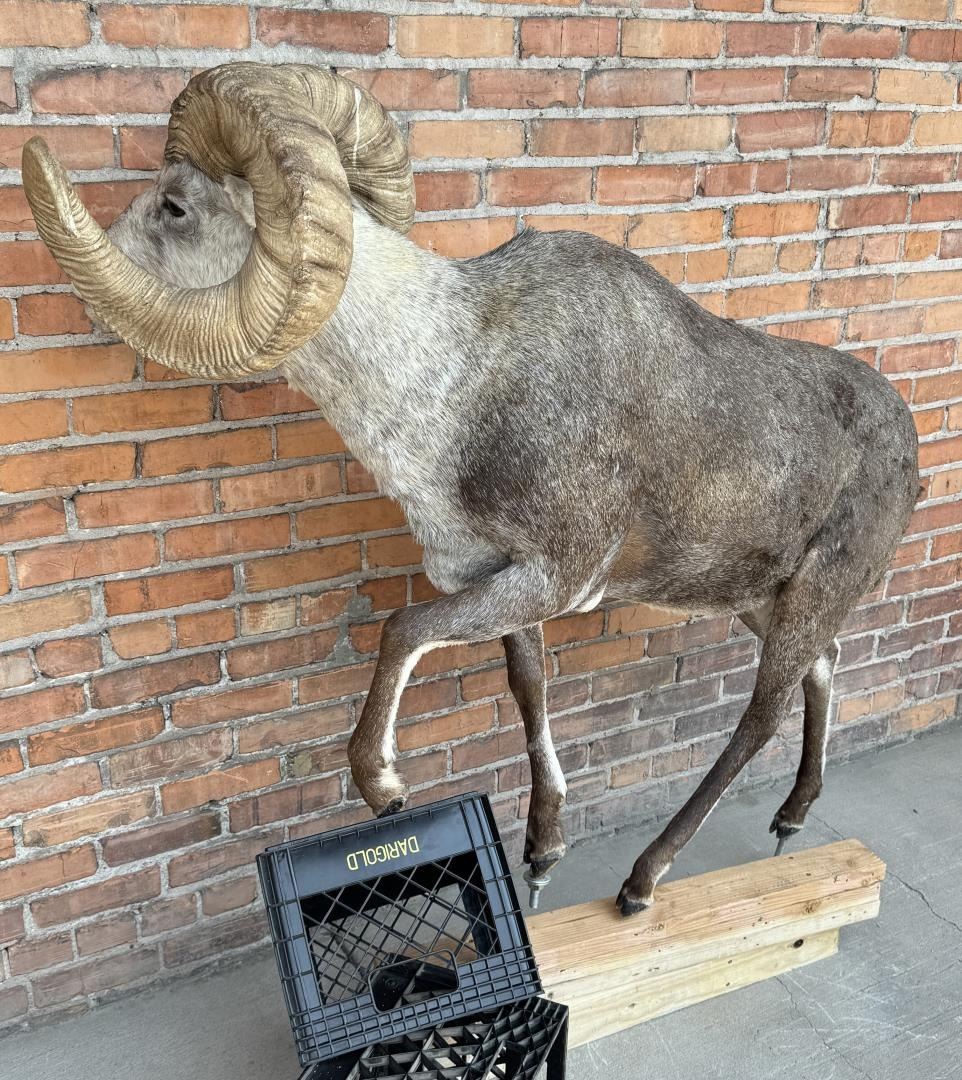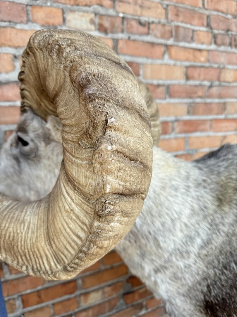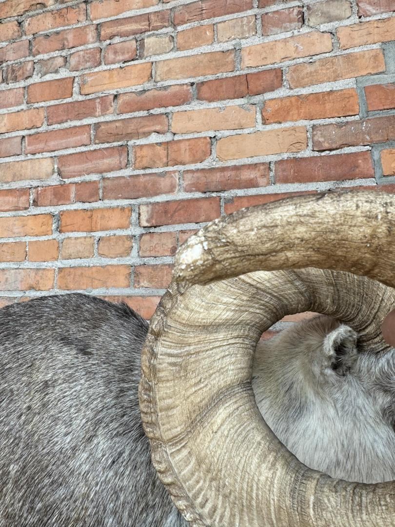 Mount measures 68 1/2" by 44" including mounting bolts. The horns are synthetic. This item requires shipment via LTL Carrier or Pickup at our facility. Provenance: The Estate of Sherwin Scott. This sheep was recorded as part of Scott's SCI Record Book 2nd Largest All Time Largest Grand Slam.