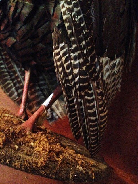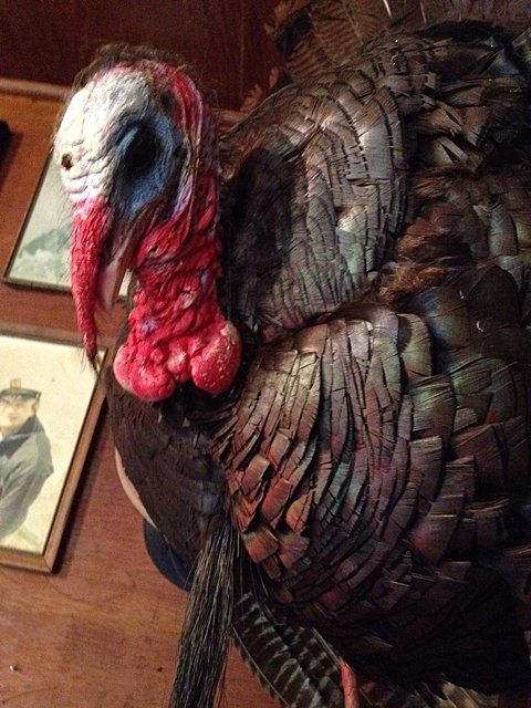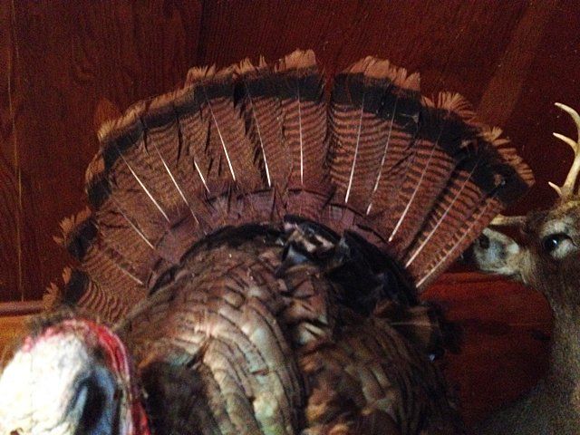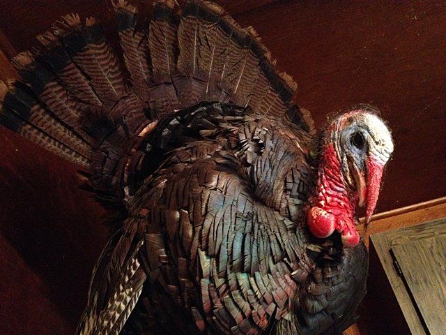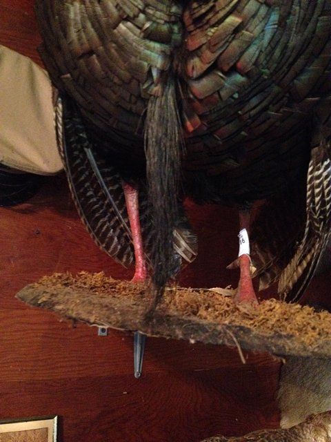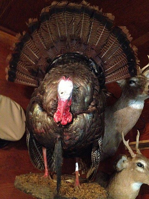 Full Body Tom Turkey Mount. Hunter practiced for a year and a half with mouth call and got him the first day out. This Tom Turkey has a magnificant 8" beard. This turkey was brought down and mounted by same person, not purchased previously. Would make a nice addition to any rustic, cabin, or Adirondack decor.
