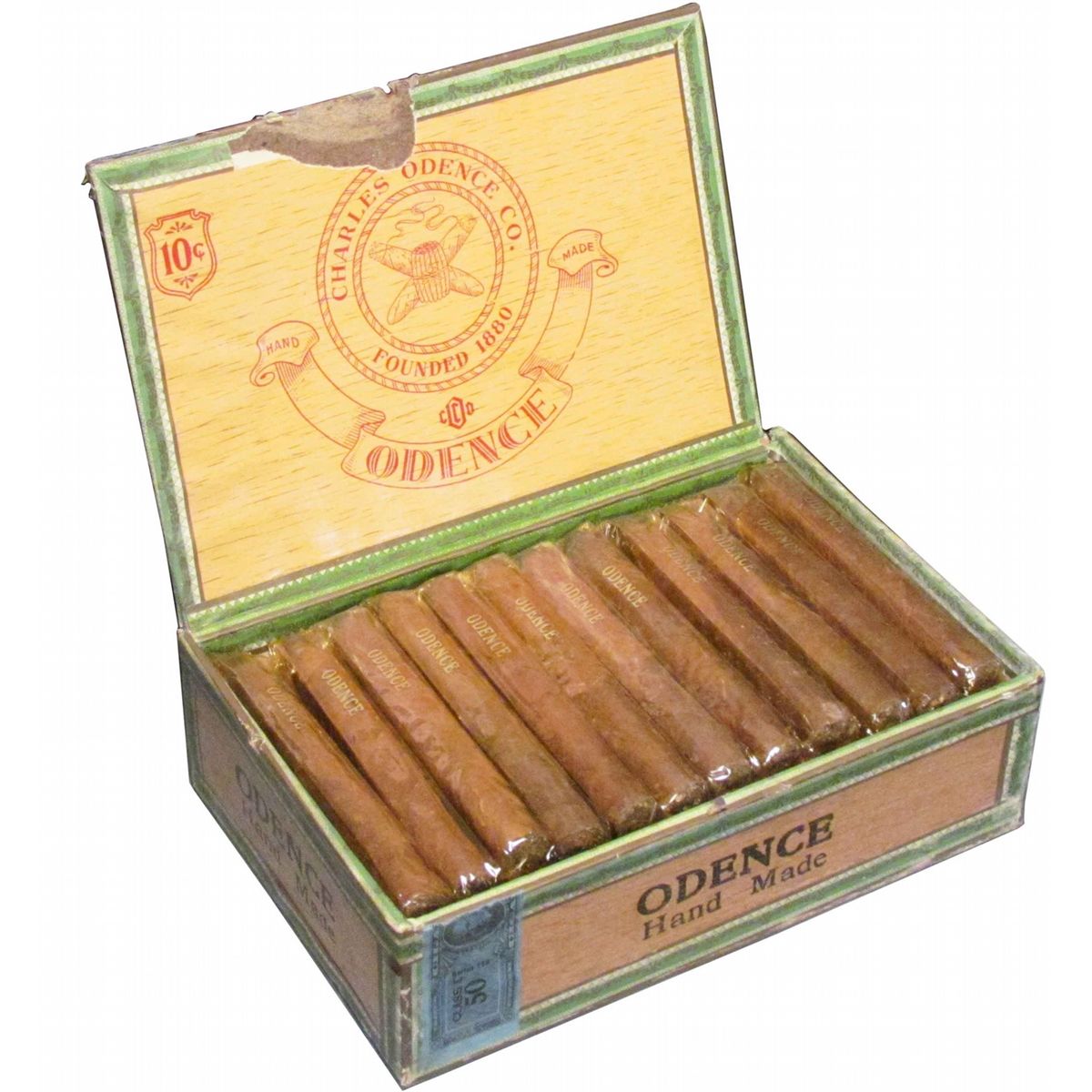 Full Box of Odence Hand Made Cigars. Damage to top inside of lid otherwise very good condition. 8 1/4 x 2 1/2 X 5 1/2 inches.