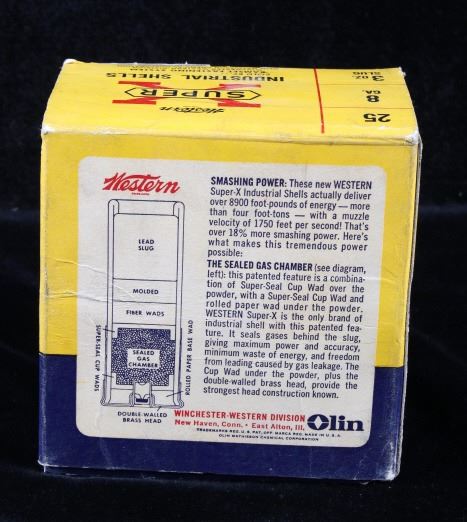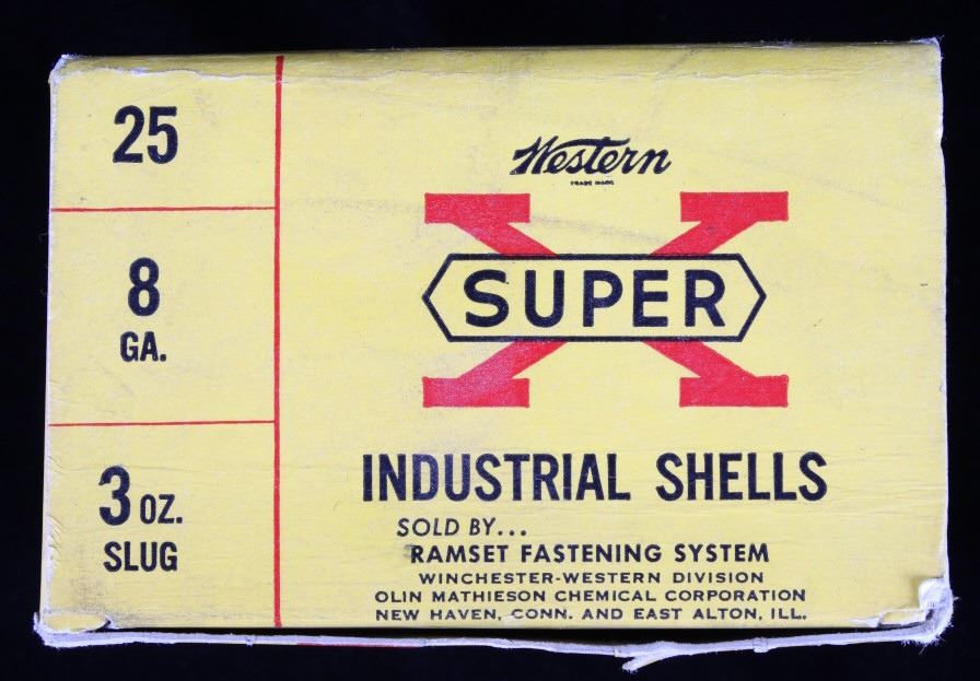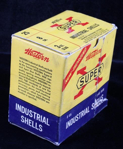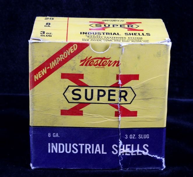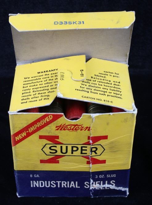 Included in this lot is a stunning Western Super X 8 GA. 3oz. slugs. This full box of Winchester 8 gauge industrial shotshells was designed to knock scale out of industrial boilers and kilns, These shells are loaded with 3 oz. lead slugs. This box is in outstanding condition with bright graphics and the box showing light wear. The box measures 5” x 3 ¾” x 5”.